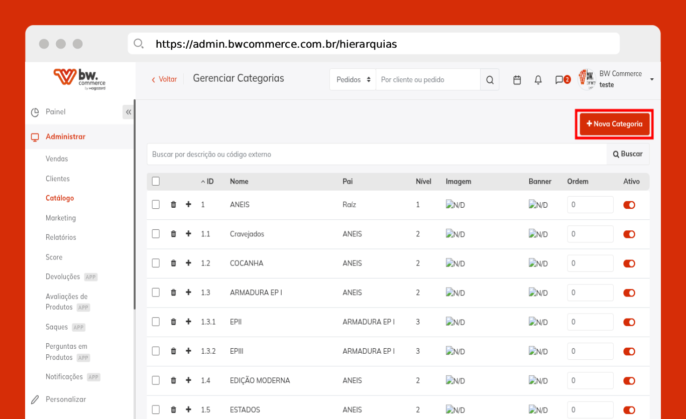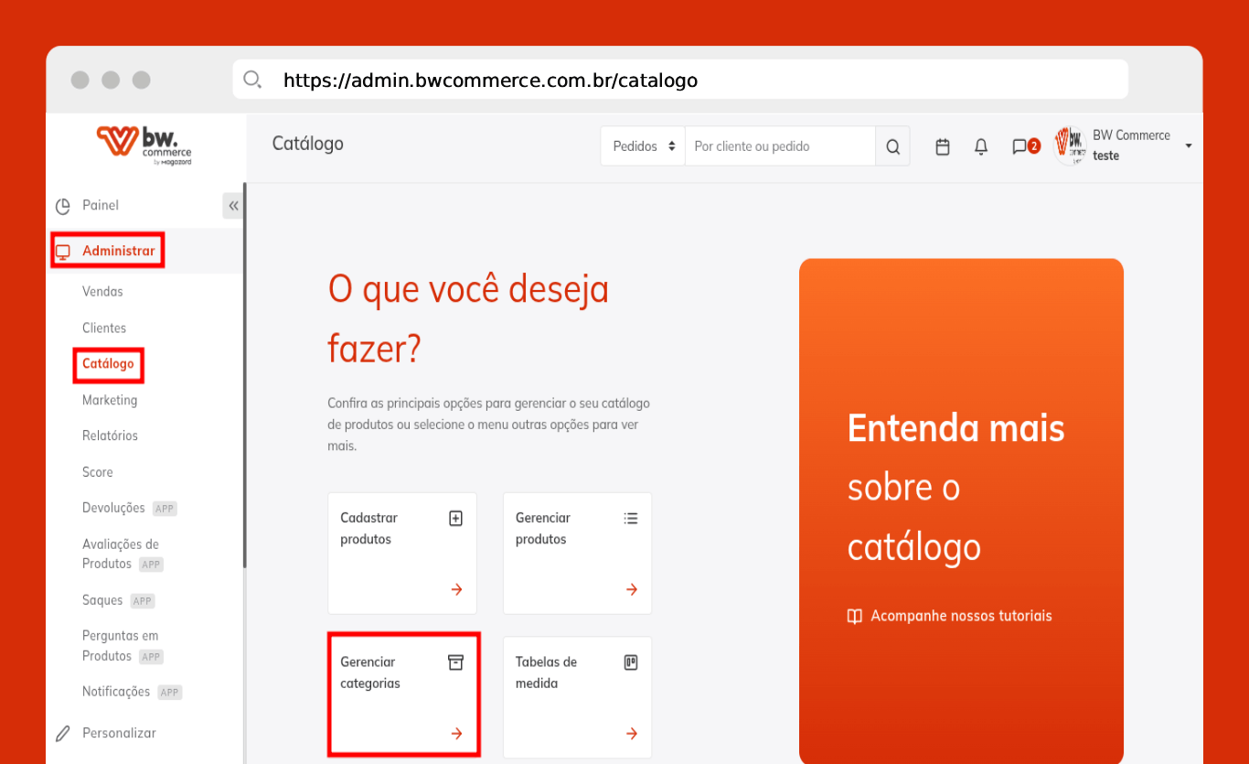 Passo 01) Acesse o painel da BW Commerce e selecione Administrar > Catálogo > Gerenciar categorias.