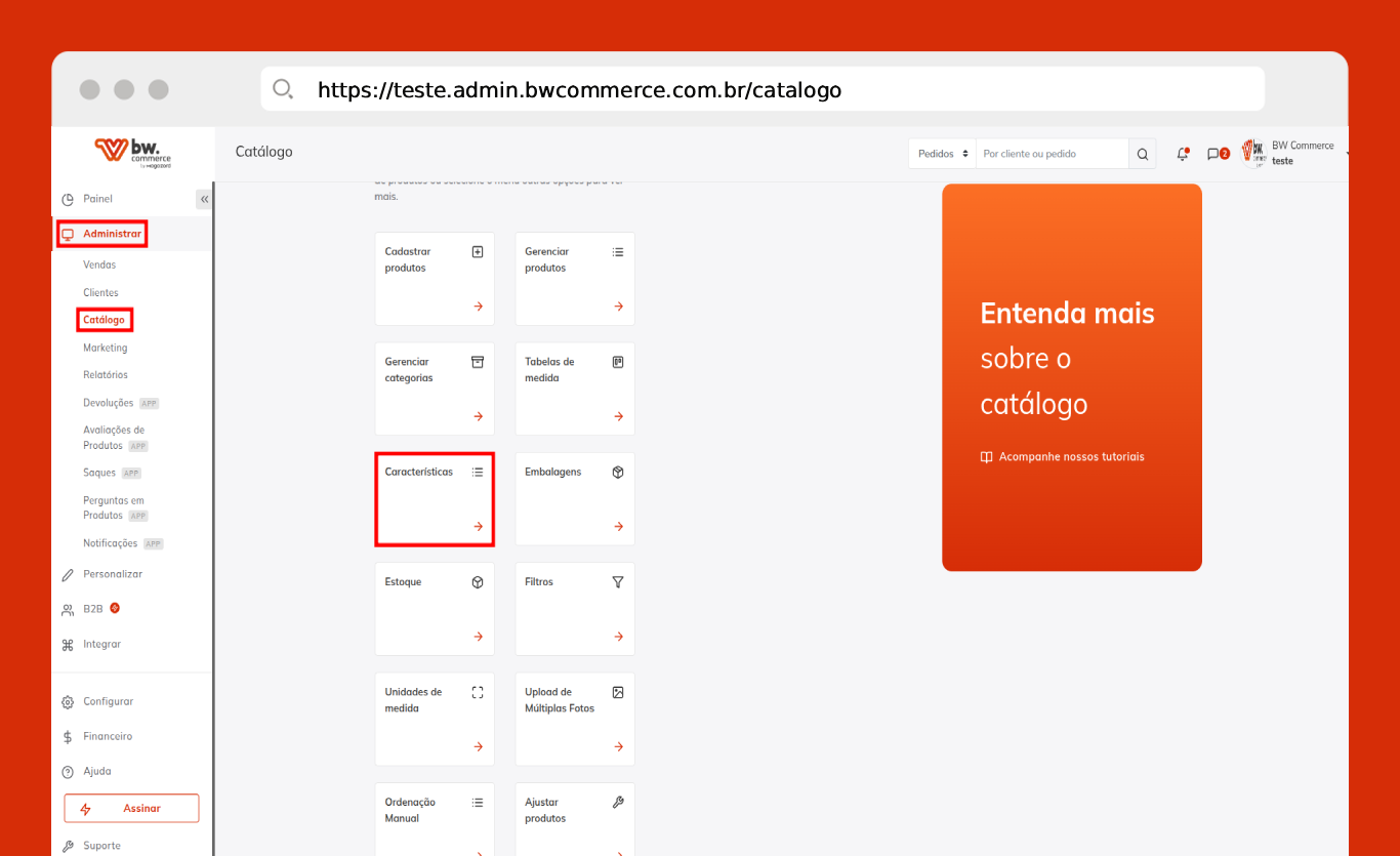 Passo 01) Acesse o painel administrativo da BW Commerce e selecione Administrar > Catálogo > Características: