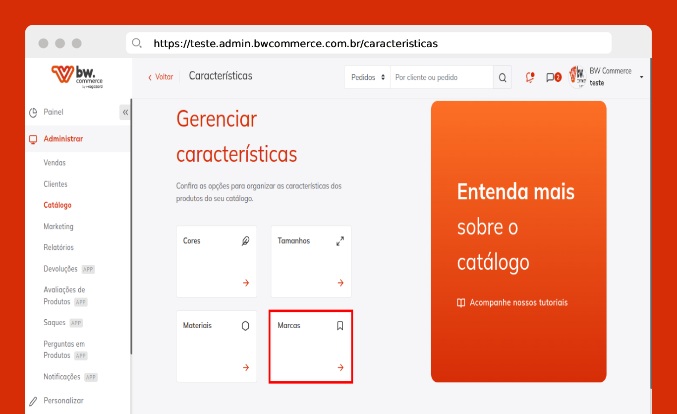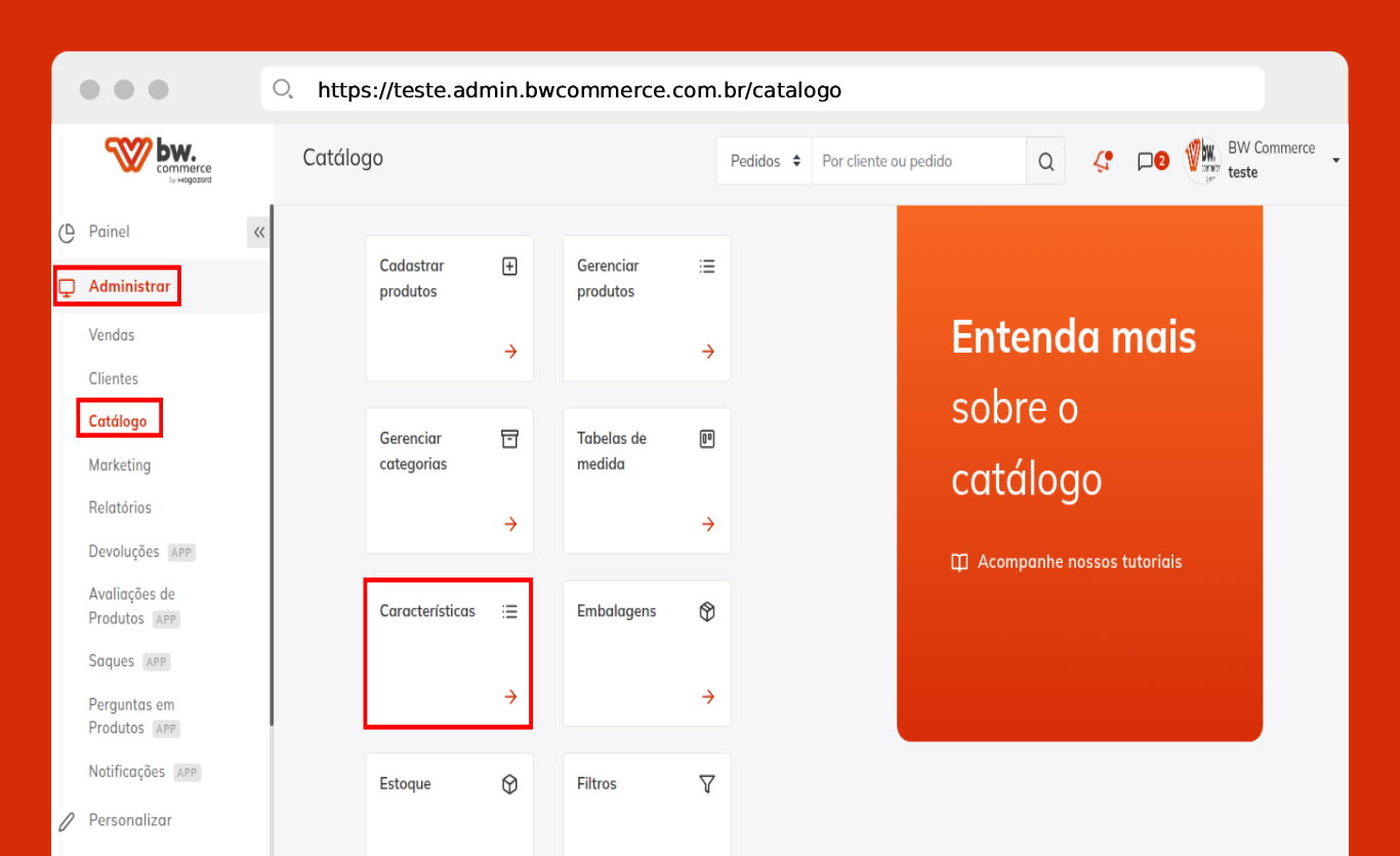 Passo 01) Acesse o painel administrativo da BW Commerce e selecione Administrar > Catálogo > Características: