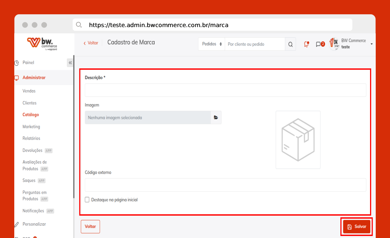 - Destaque na página inicial: Habilite esta opção caso queira que a marca apareça em destaque na página inicial da sua loja virtual.