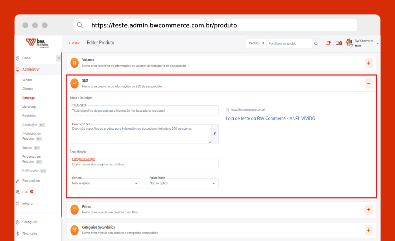 - Título SEO: Título específico do produto para indexação nos buscadores.