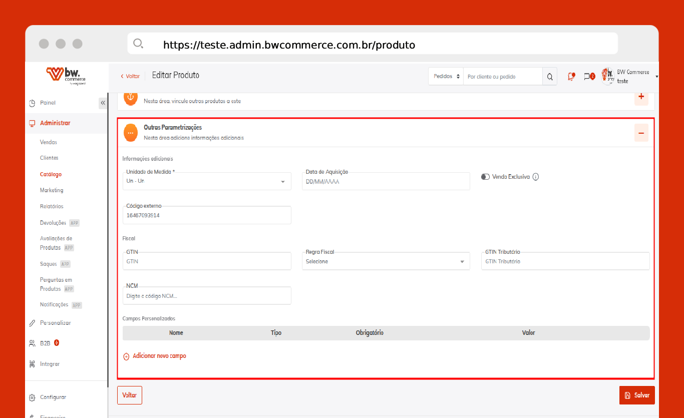- Código externo: Esse código serve para identificar o produto de forma única em integrações, como com marketplaces, ERPs e etc.