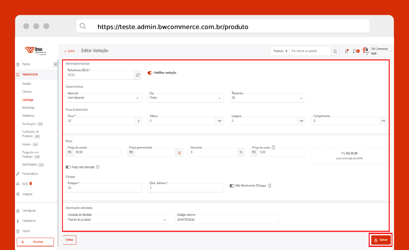 - Preço de venda*: Inclua o preço que seu cliente pagará pela mercadoria.