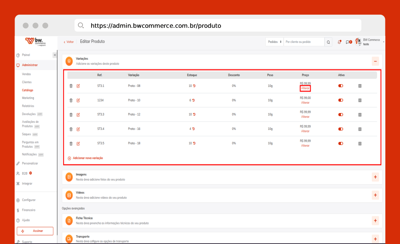 Caso alguma variação sua tenha o valor diferente das outras, clique em Alterar para modificar.