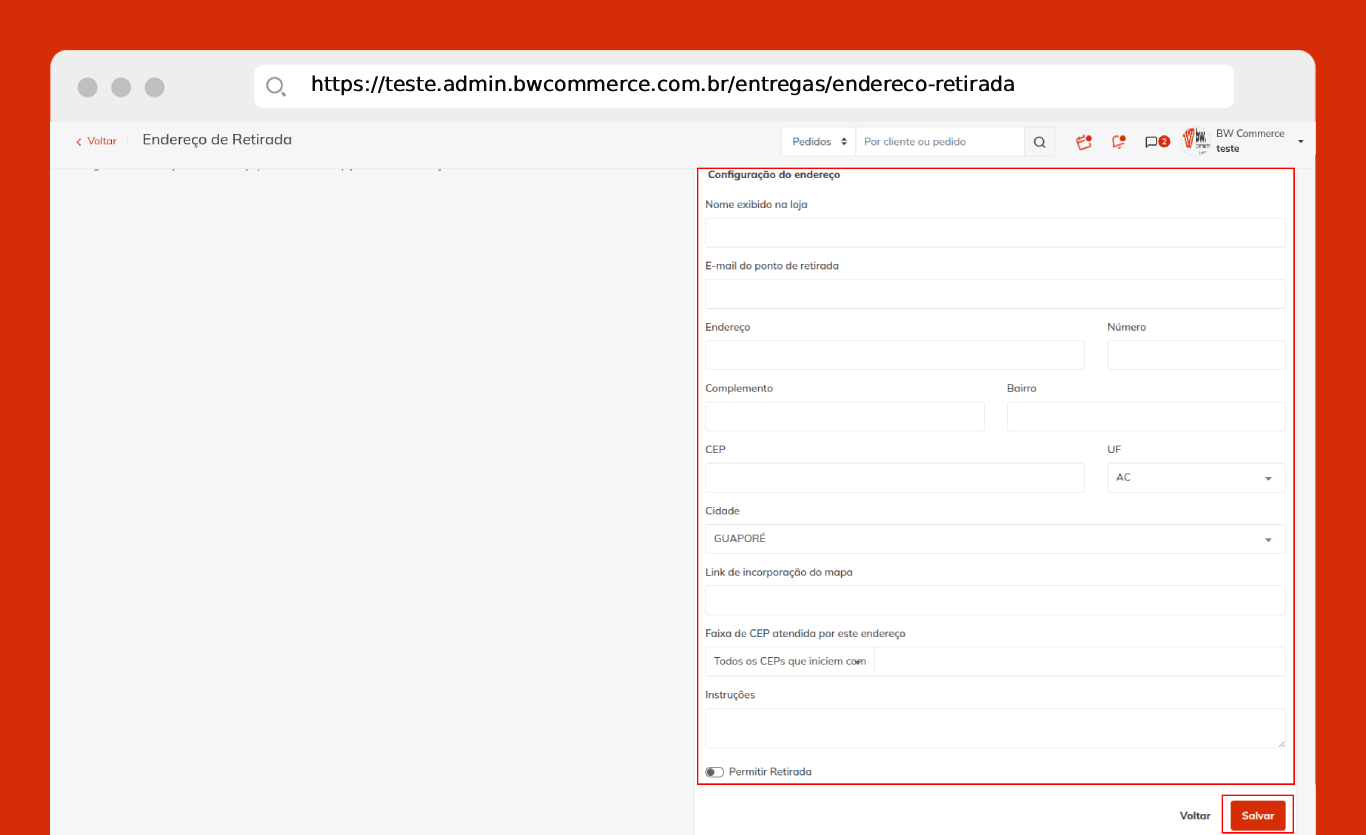 - Instruções: Neste campo, você pode adicionar orientações importantes para os clientes que optarem pela retirada do pedido na loja física. Utilize este espaço para informar detalhes sobre qualquer outra instrução relevante para facilitar a retirada do pedido.