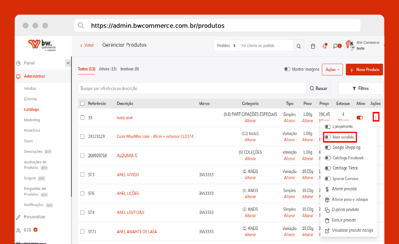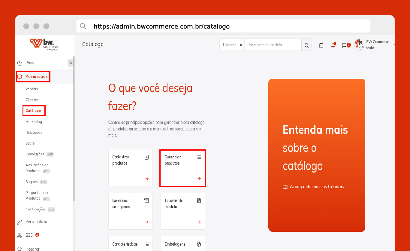 Passo 01) Acesse o painel administrativo da BW Commerce e selecione Administrar > Catálogo e logo após Gerenciar produtos.
