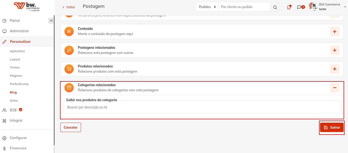 Passo 01) Acesse o painel administrativo da BW Commerce e selecione Personalizar > Blog > Categorias: