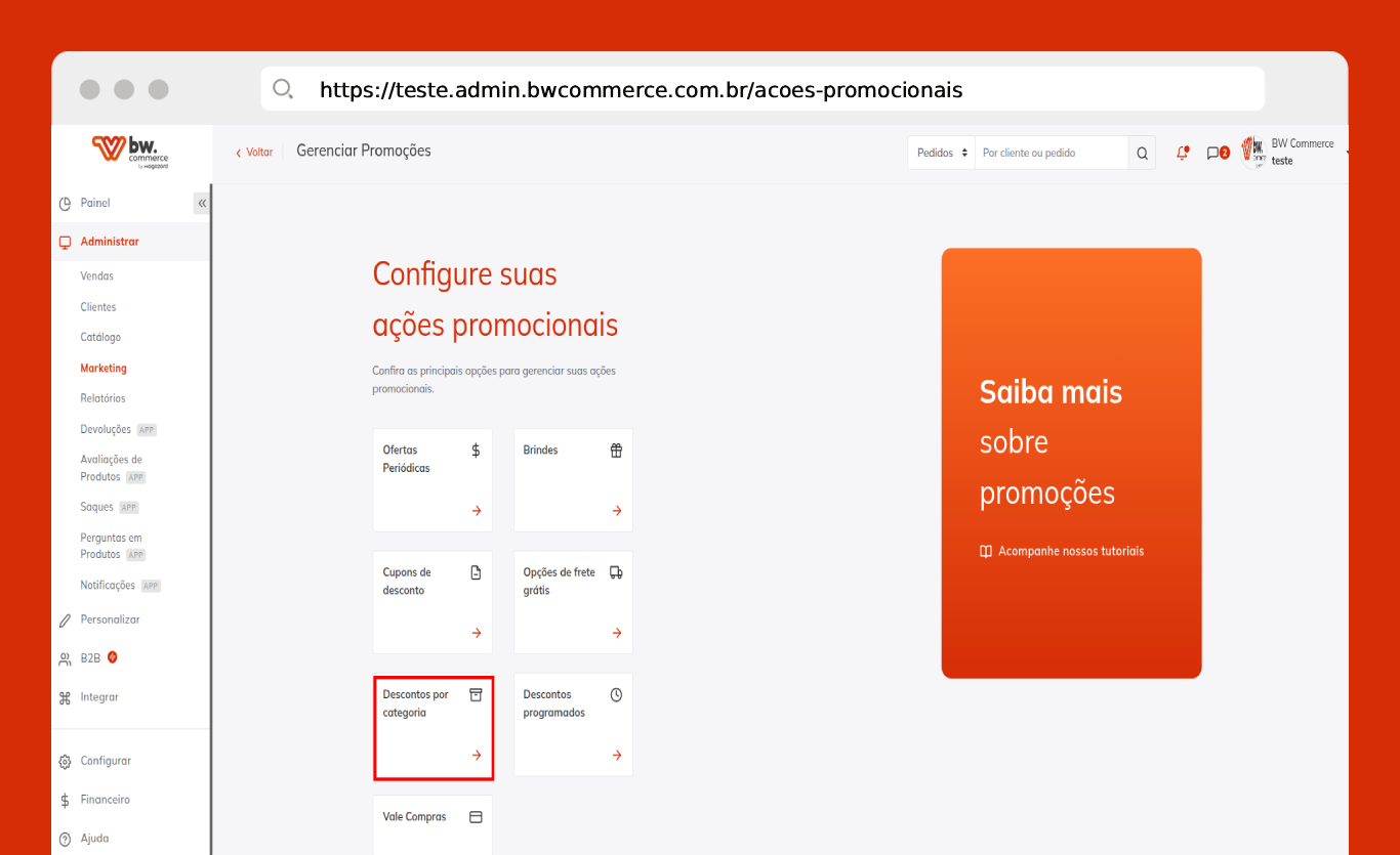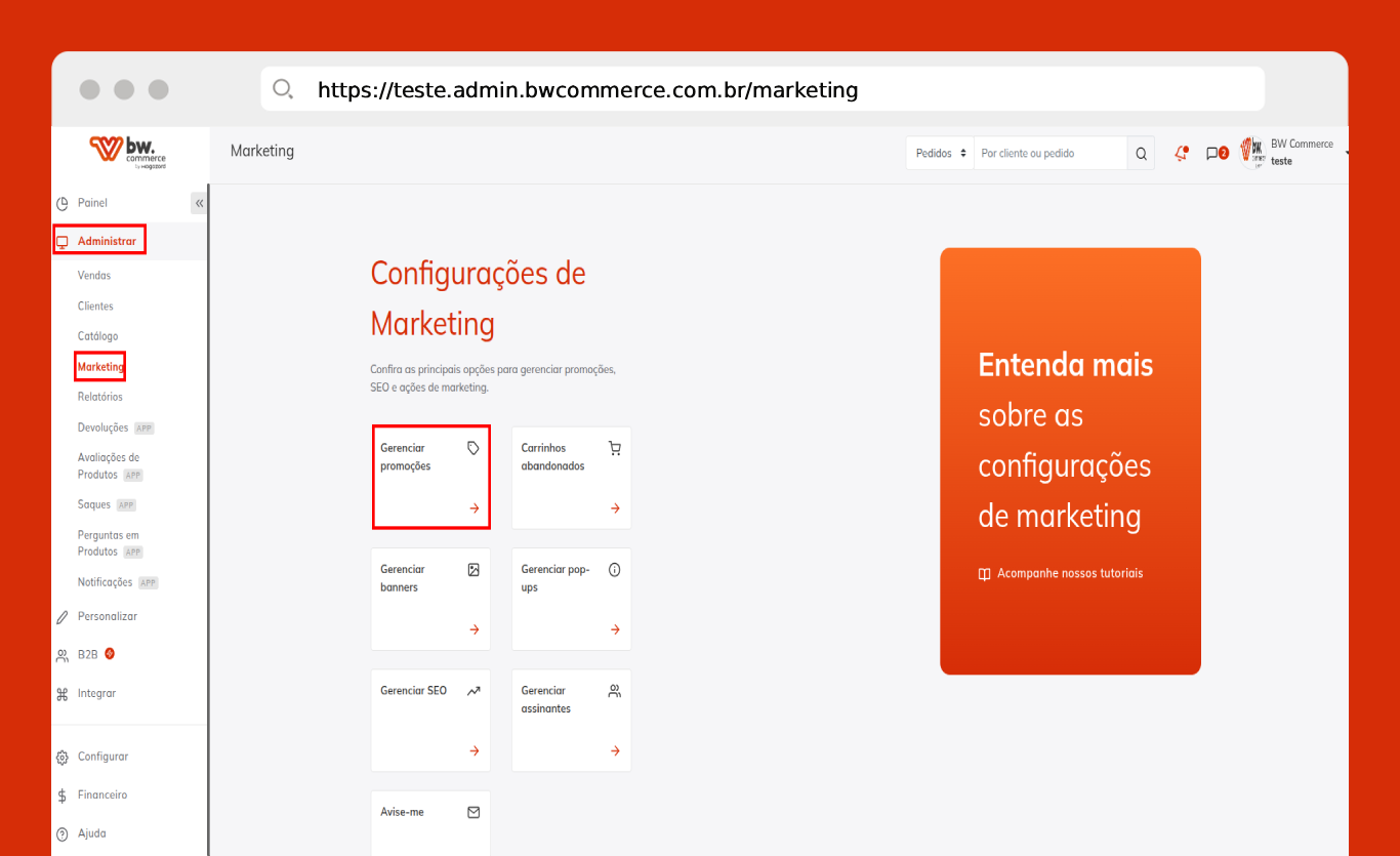 Passo 01) Acesse o painel da BW Commerce e selecione Administrar > Marketing. Logo em seguida, clique em Gerenciar Promoções.