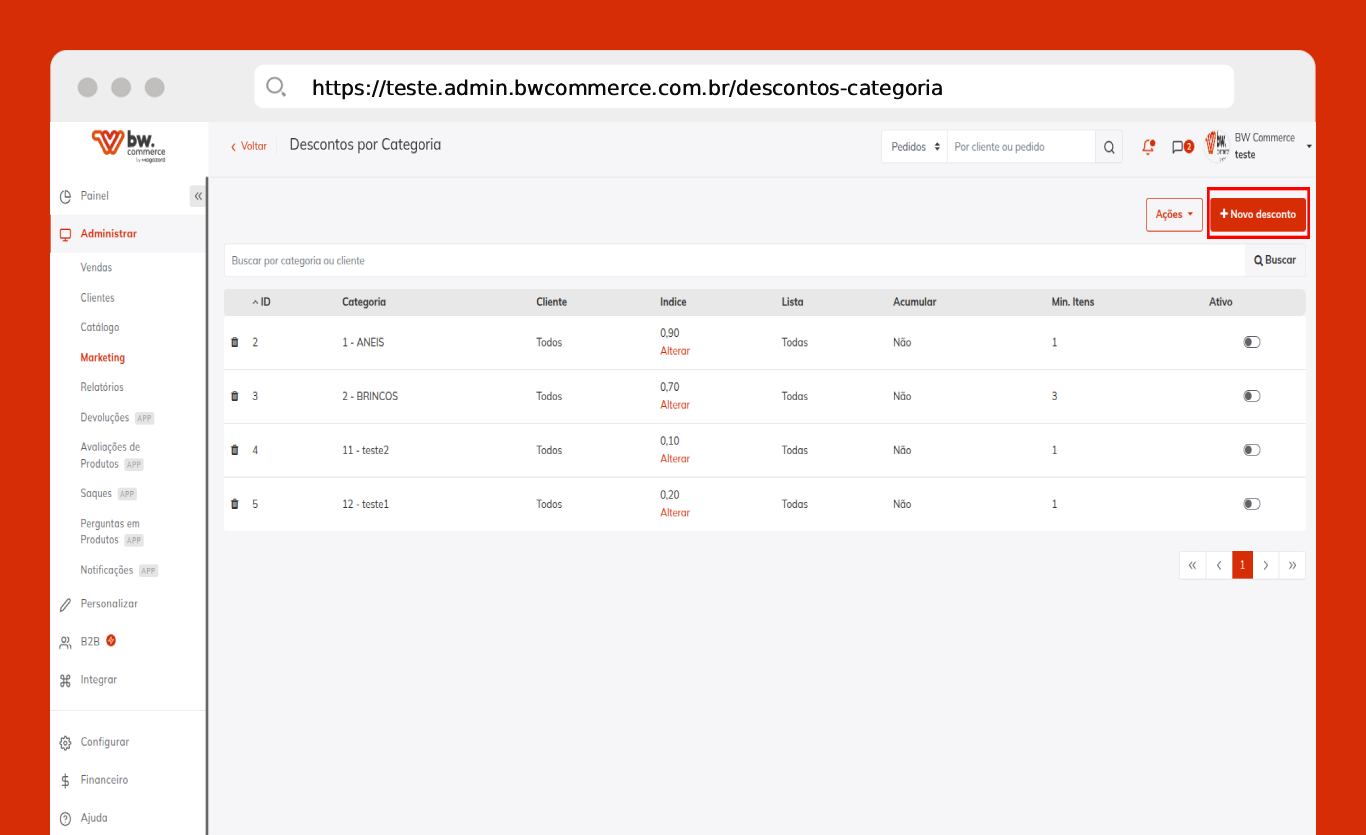 - Mínimo de itens: Quantidade mínima de itens da mesma categoria no carrinho para aplicar o desconto.