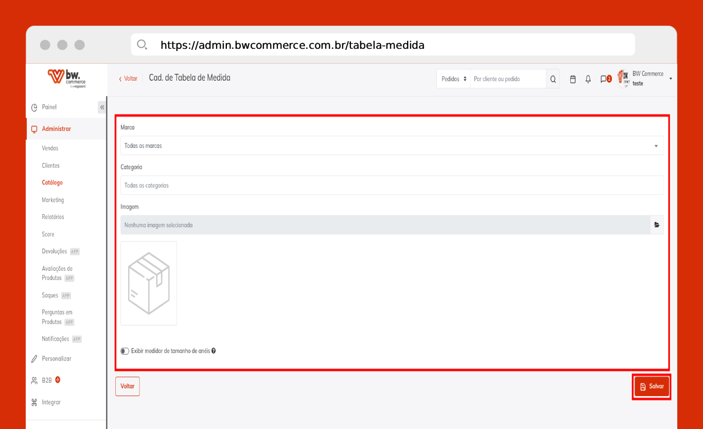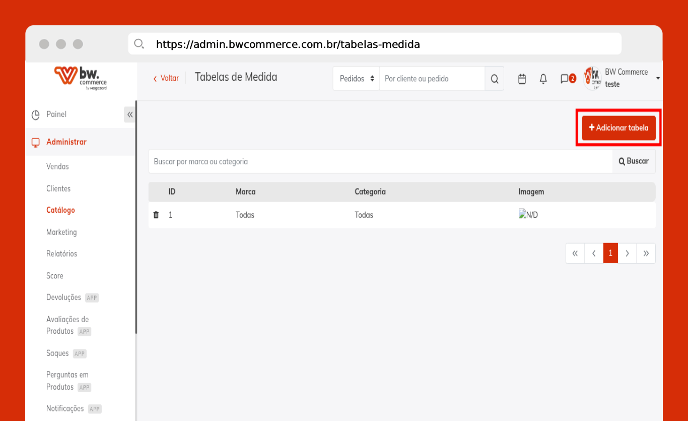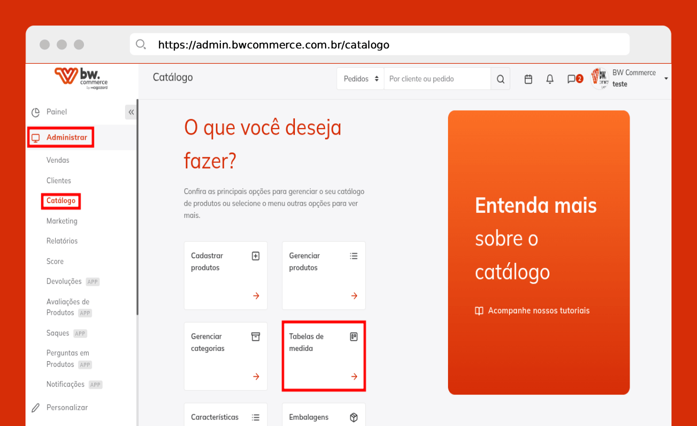 Passo 01) Acesse o painel administrativo da BW Commerce e selecione Administrar > Catálogo > Tabela de Medidas.