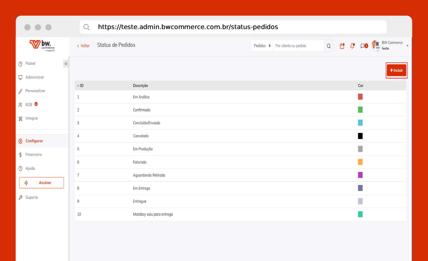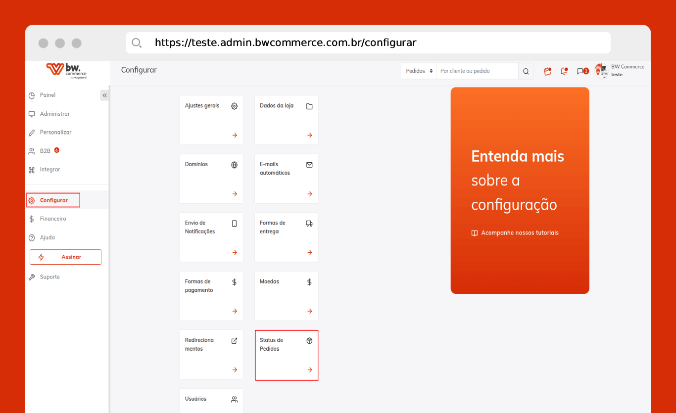 Passo 01) Acesse o painel administrativo da BW Commerce selecione Configurar > Status de pedido.