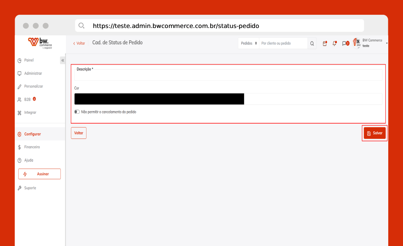 - Não permitir o cancelamento do pedido: Ao habilitar esta opção, os pedidos que estiverem neste status não poderão ser cancelados.