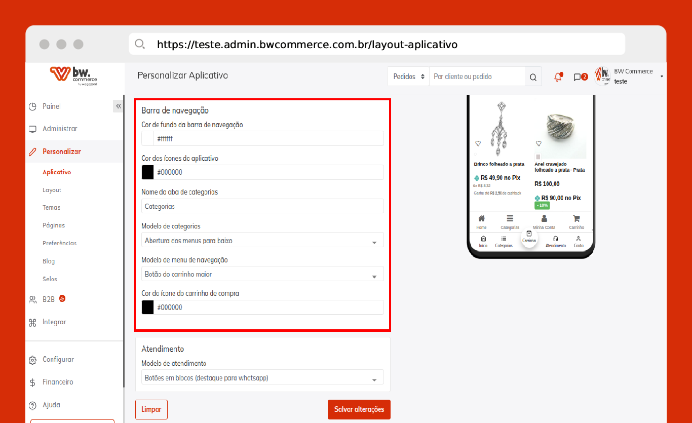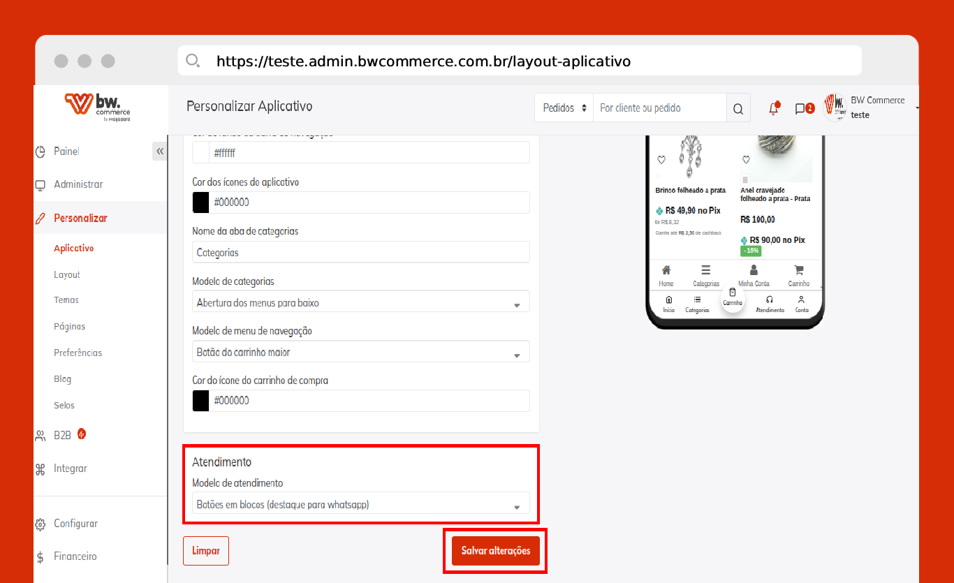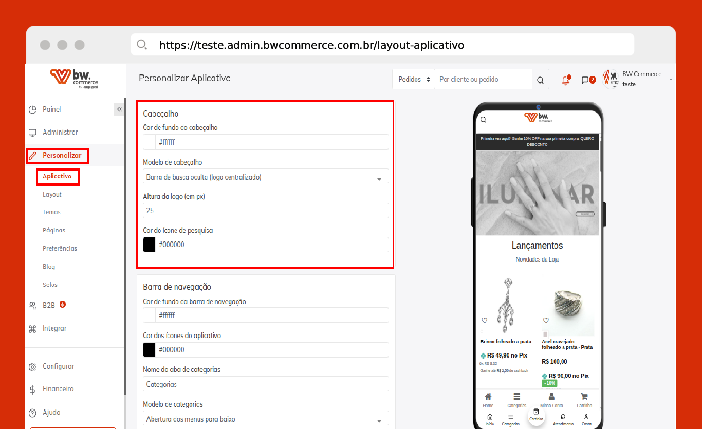 Passo 01) Acesse o painel administrativo da BW Commerce e selecione Personalizar > Aplicativo.