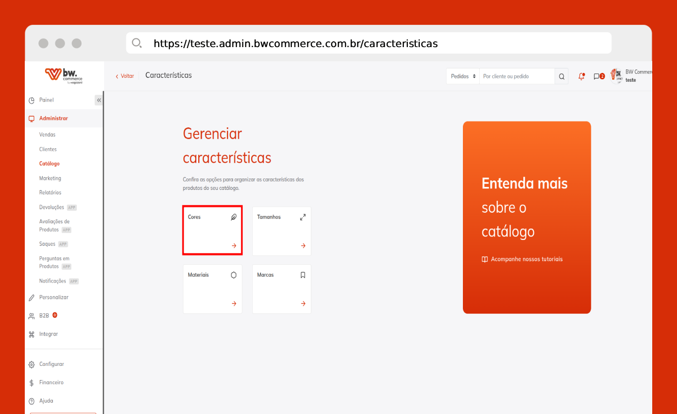 Passo 01) Acesse o painel administrativo da BW Commerce e selecione Administrar > Catálogo > Características.