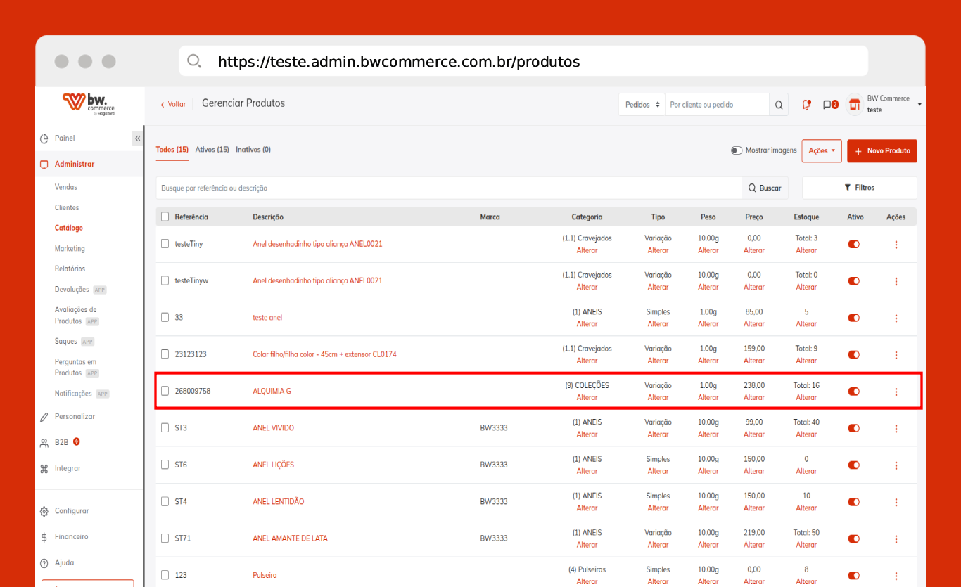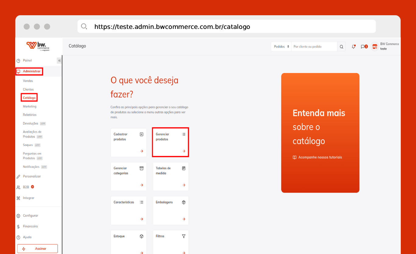 Passo 05) Acesse o painel administrativo da BW Commerce e selecione Administrar > Catálogo > Gerenciar produtos.