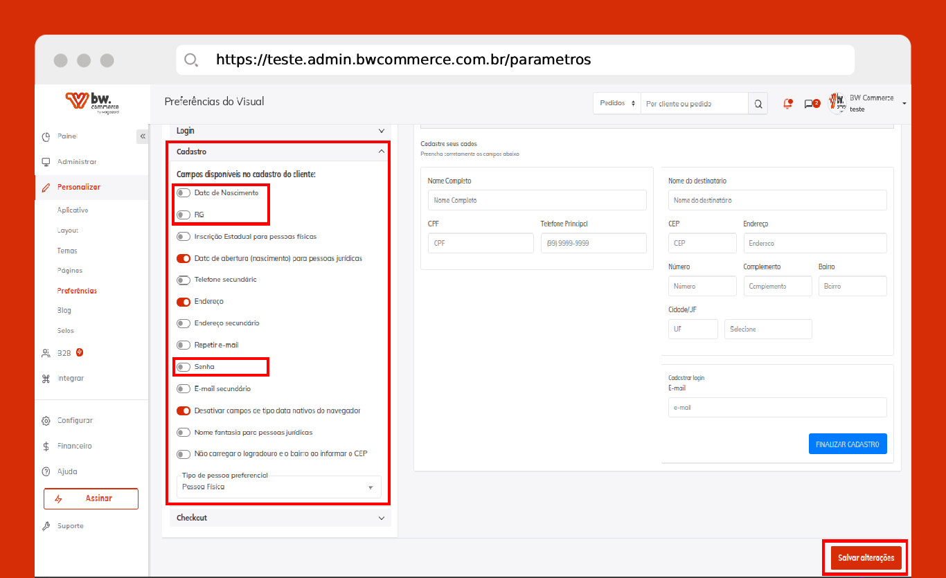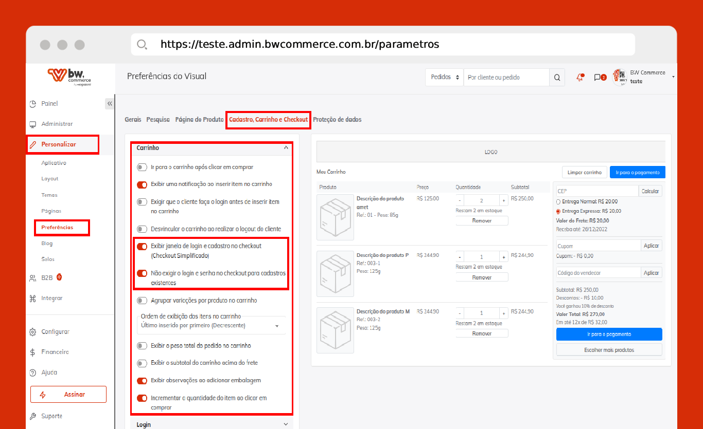 Passo 01) Acesse o painel administrativo da BW Commerce e selecione Personalizar > Preferências. Após, clique na aba Cadastro, Carrinho e Checkout > Carrinho em seguida habilite os seguintes campos: