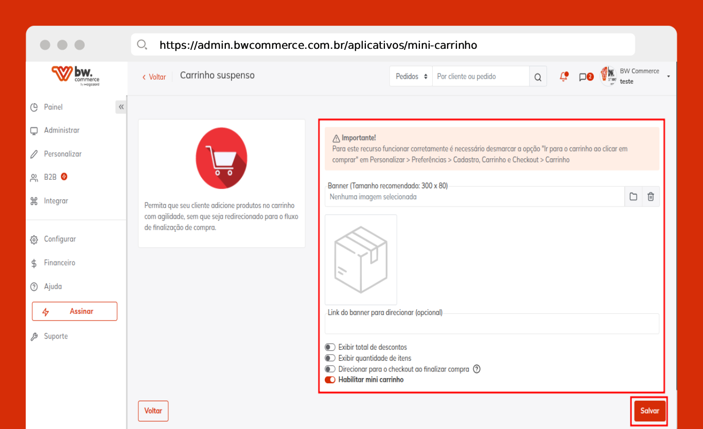 Marque o campo Habilitar mini carrinho e clique em Salvar.