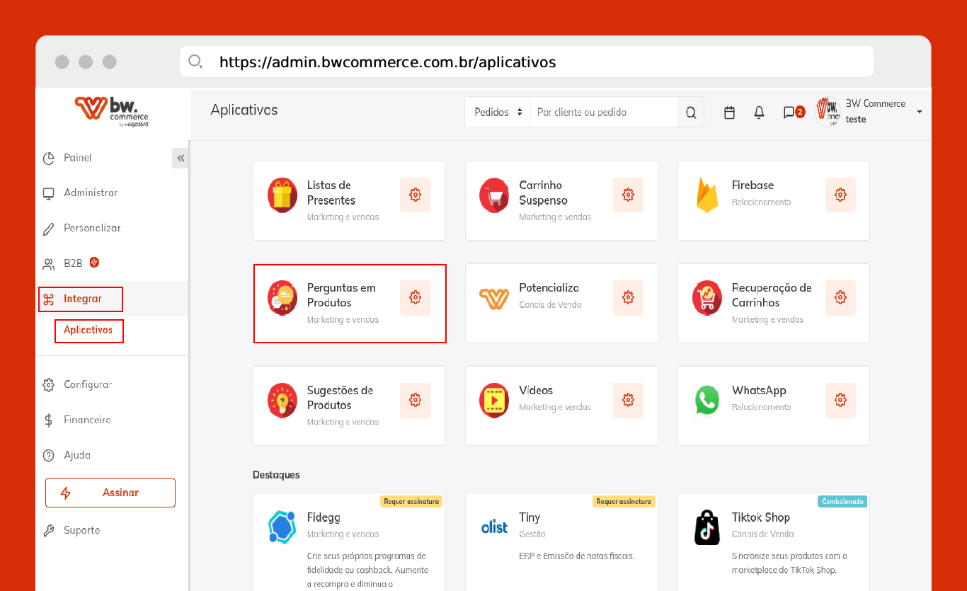 Passo 01) Acesse o painel administrativo da BW Commerce e selecione Integrar > Aplicativos em seguida Perguntas em Produtos.