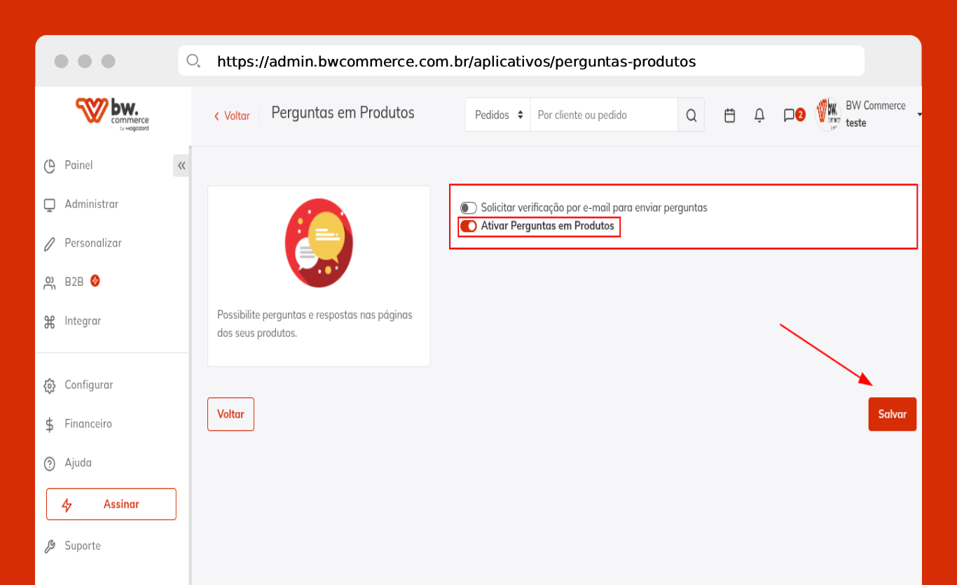 Marque como ativo o campo "Ativar Perguntas em Produtos" e clique em Salvar.