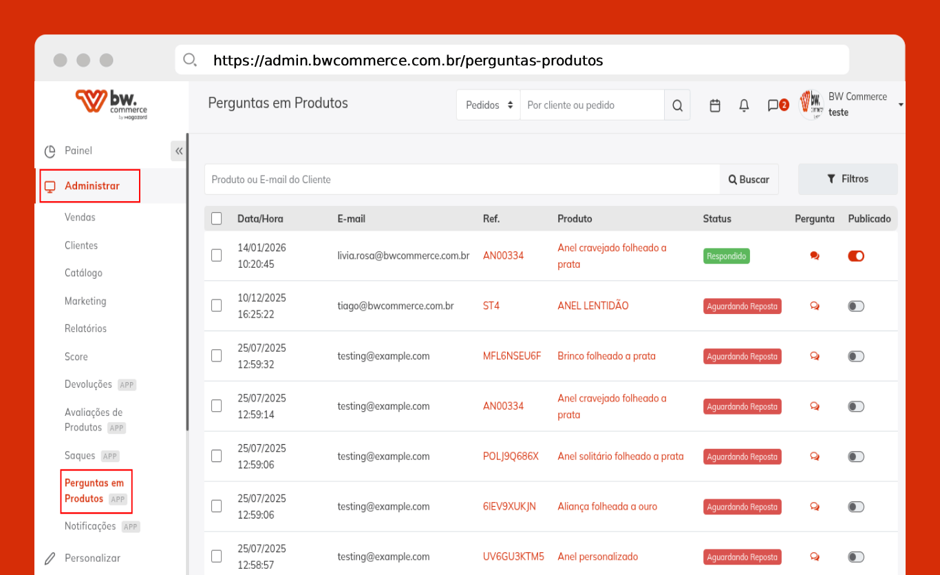 Passo 01) Acesse o painel administrativo da BW Commerce e selecione Administrar > Perguntas em Produtos.
