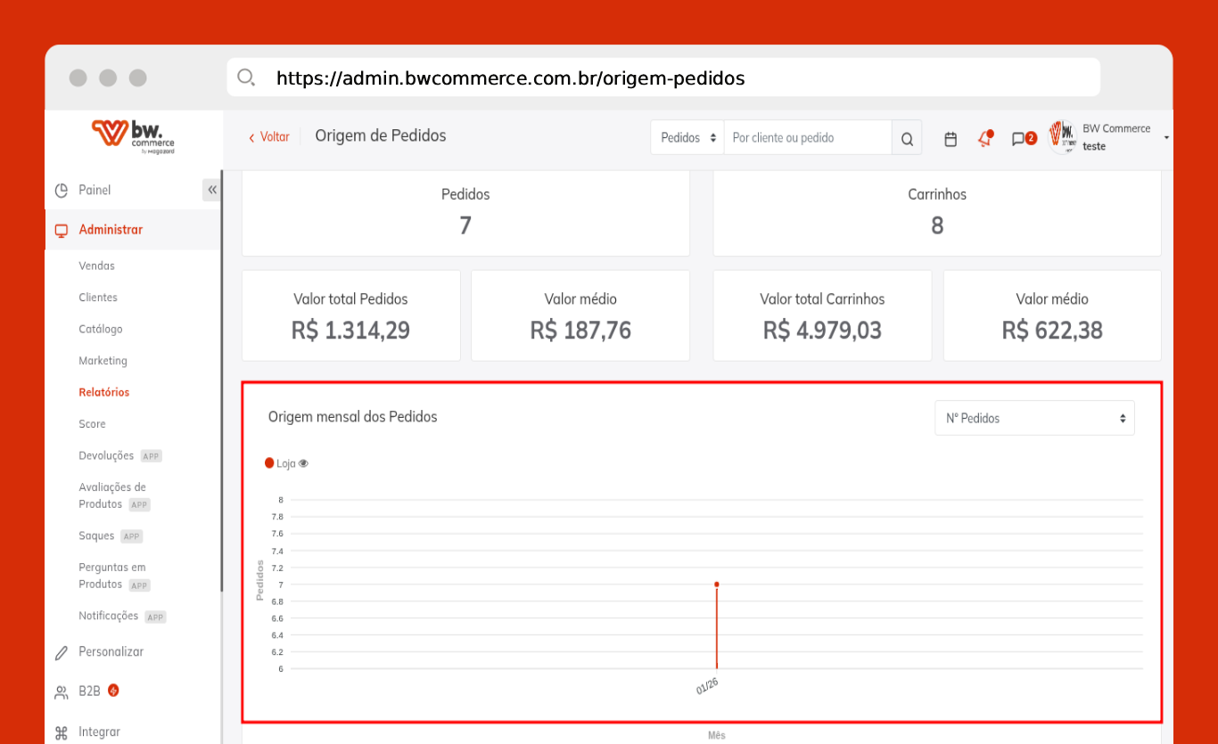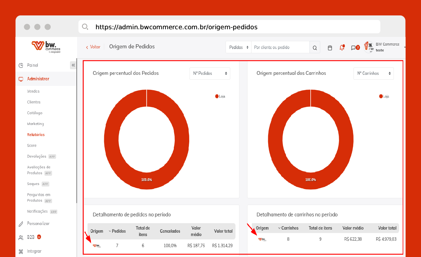 Passo 01) Acesse o painel administrativo da BW Commerce e selecione Administrar > Relatórios > Origem de pedidos.