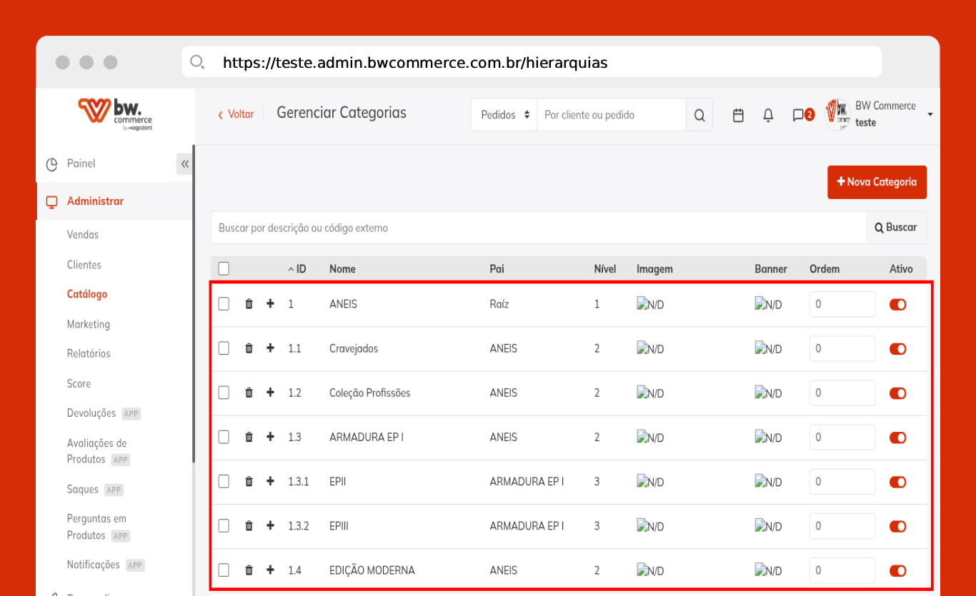 Passo 01) Acesse o painel administrativo da BW Commerce e selecione Administrar > Catálogo > Gerenciar Categorias.