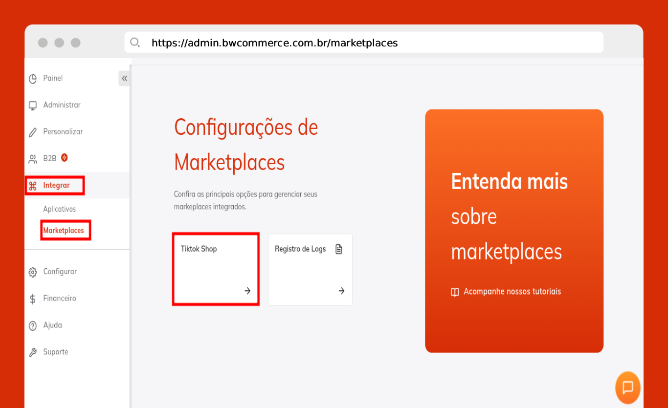 Passo 05) Após associar as categorias de sua loja virtual com a do Tiktok Shop, navegue no menu principal e clique em Integrar > Marketplaces e selecione a opção Tiktok Shop.