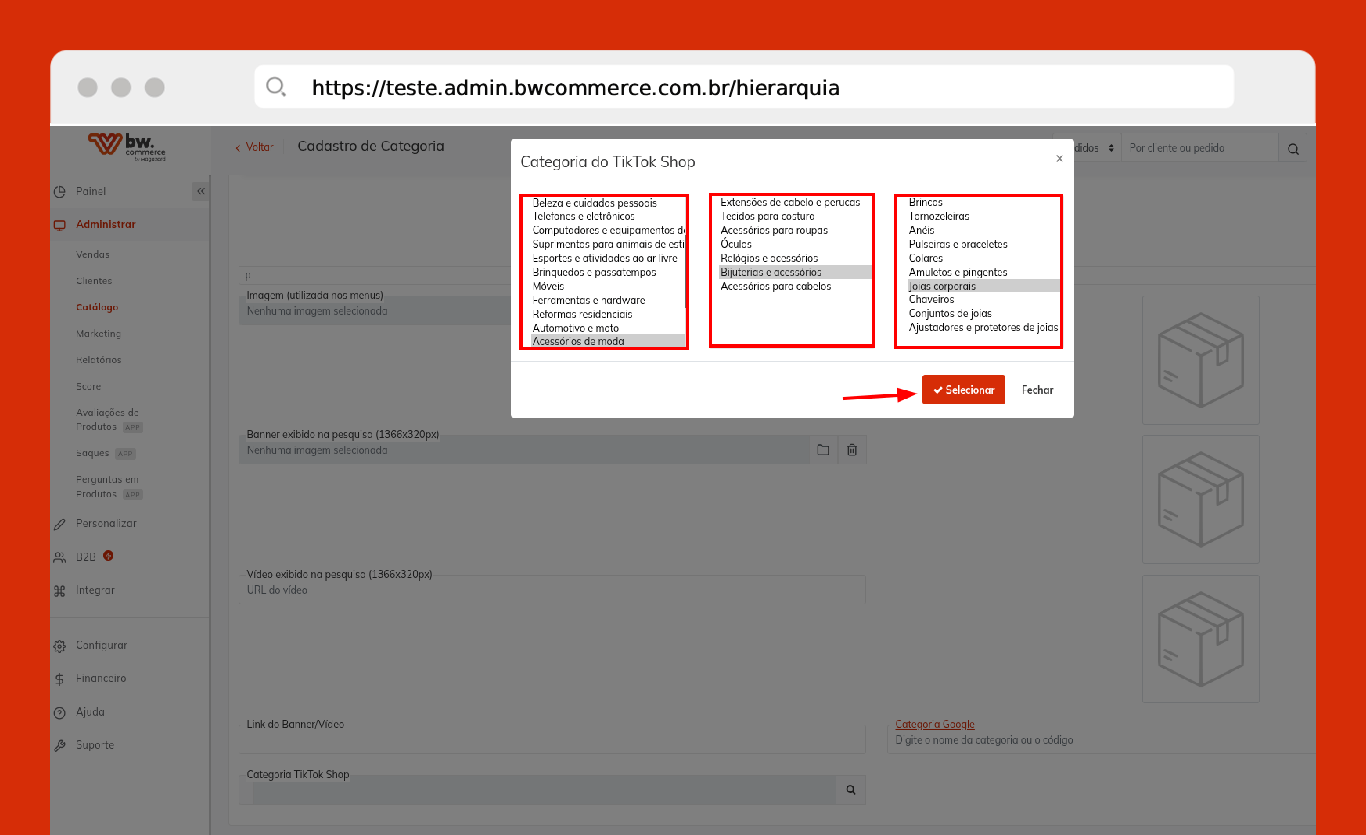 Passo 04) Selecione em qual categoria do TikTok Shop, os produtos vinculados a categoria existente na loja virtual, devem ser vinculados: