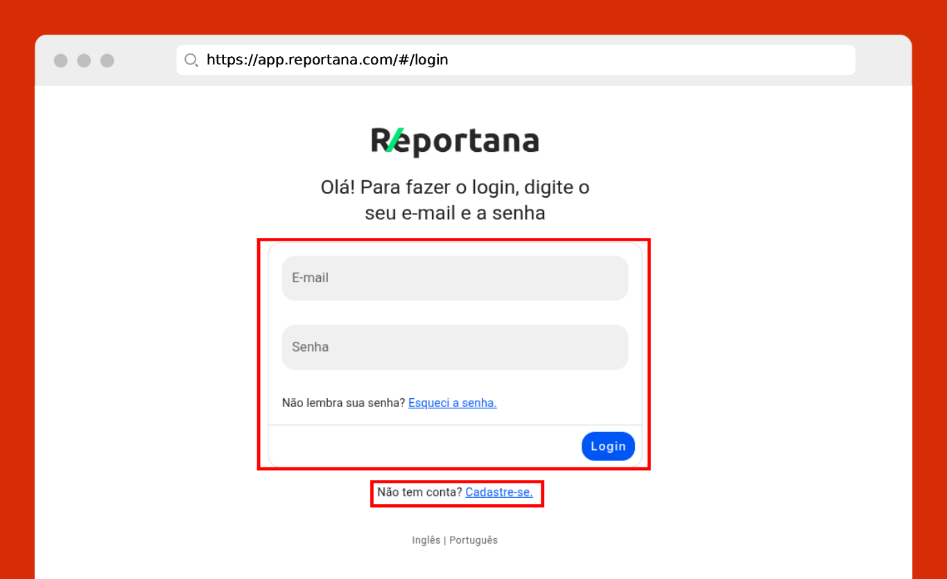 Passo 1) Acesse o painel da Reportana e realize o login. Caso ainda não possua uma conta, será necessário efetuar o cadastro antes de prosseguir.