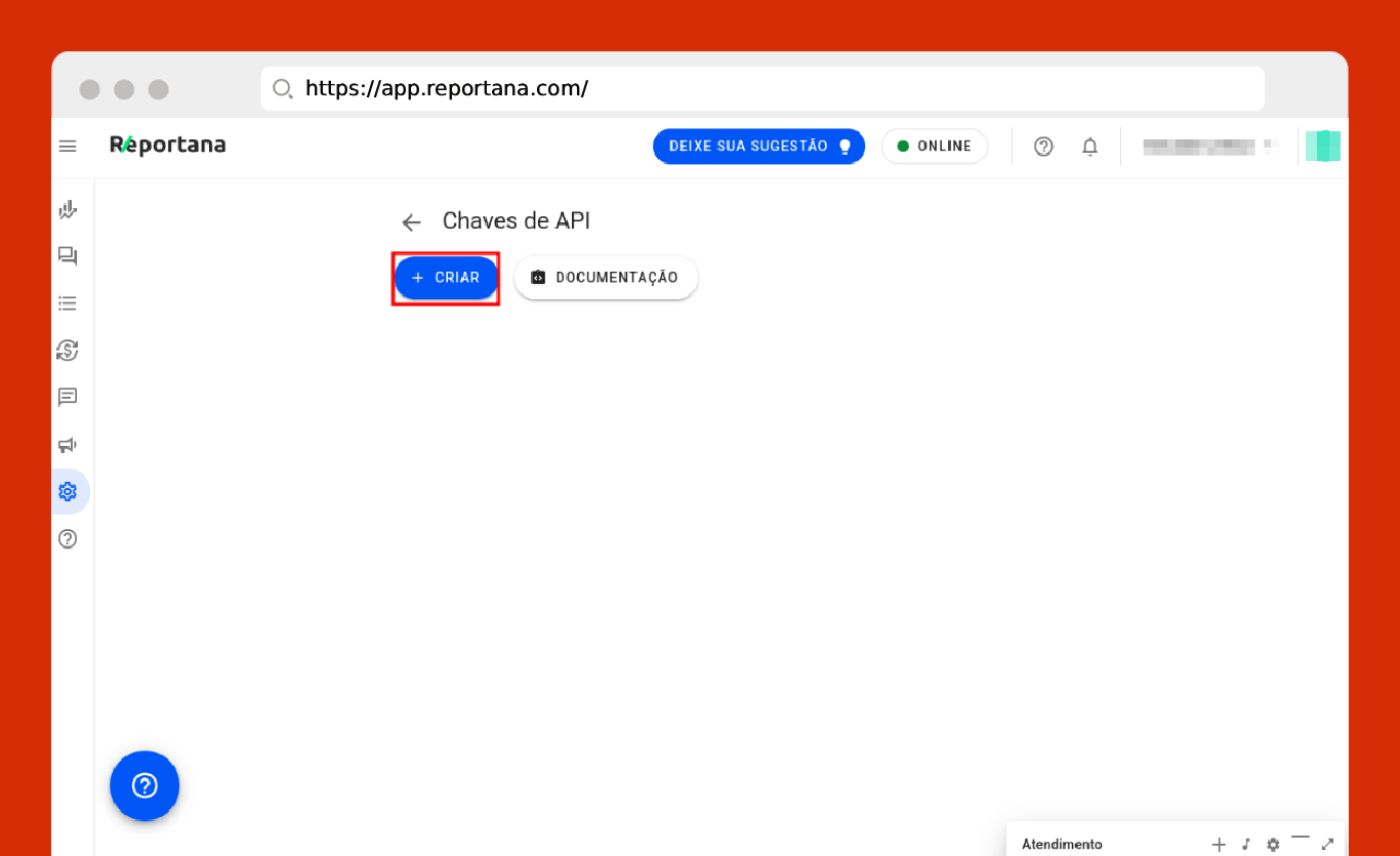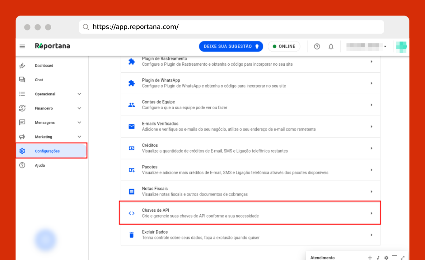 Passo 2) Após acessar ao painel da Reportana, clique em Configurações > Chaves de API.