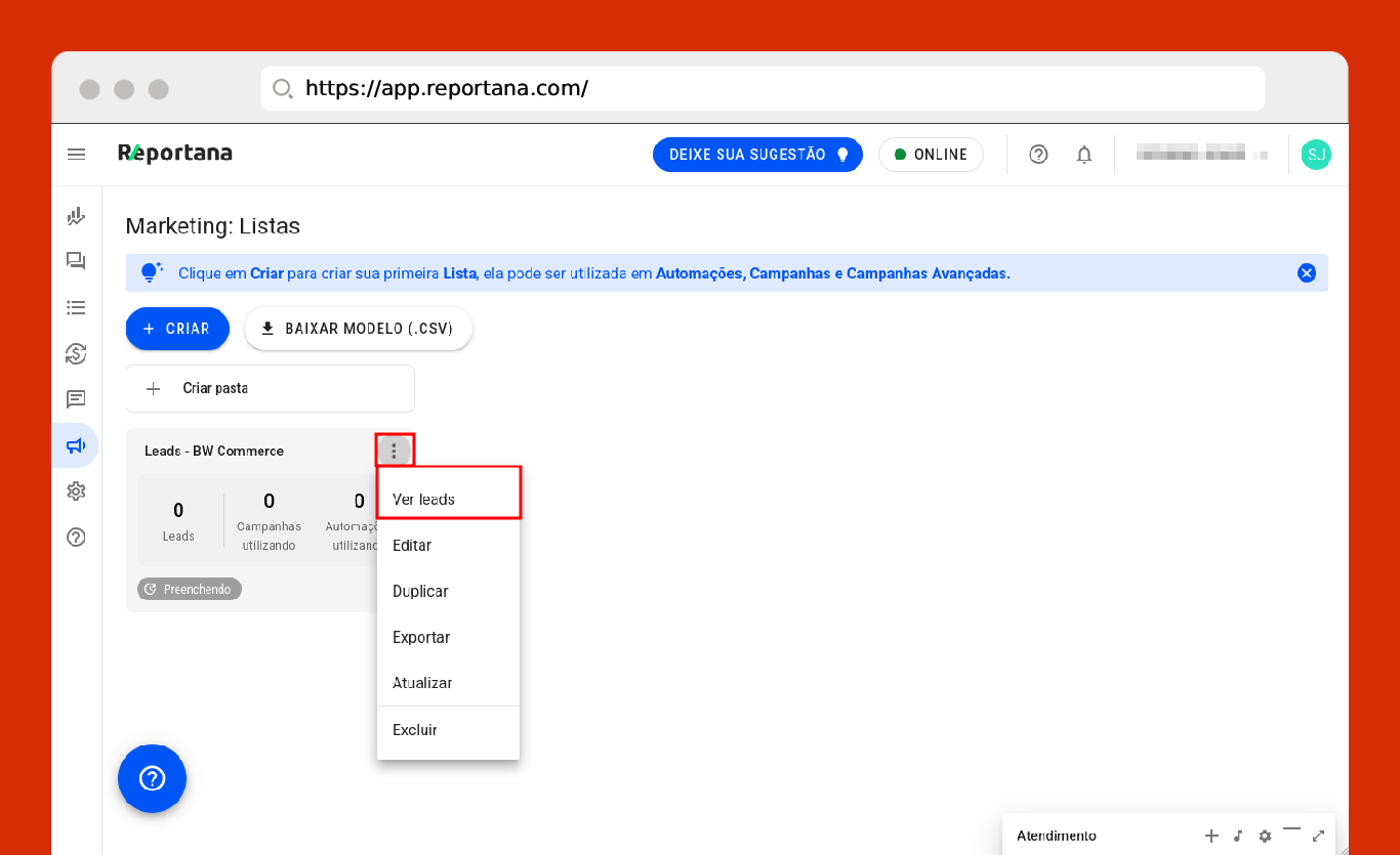 Passo 9) Localize a lista criada e clique nos três pontinhos ao lado e selecione a opção Ver Leads :