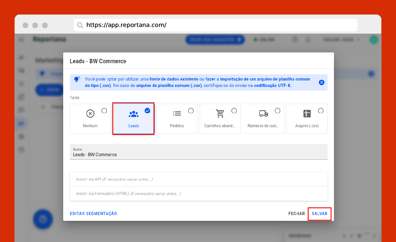 Passo 8) Após isso, selecione o tipo Leads e clique em Salvar: