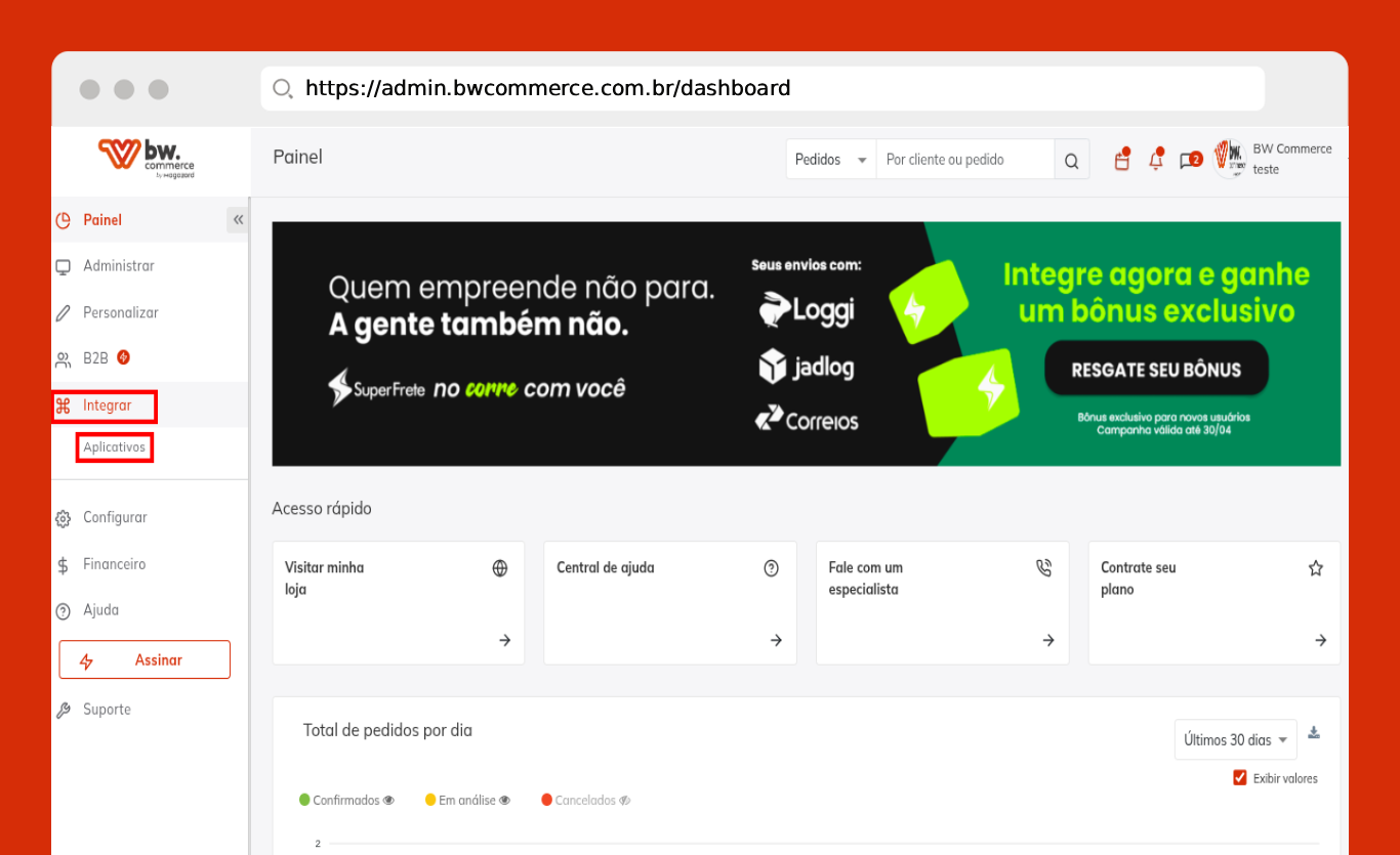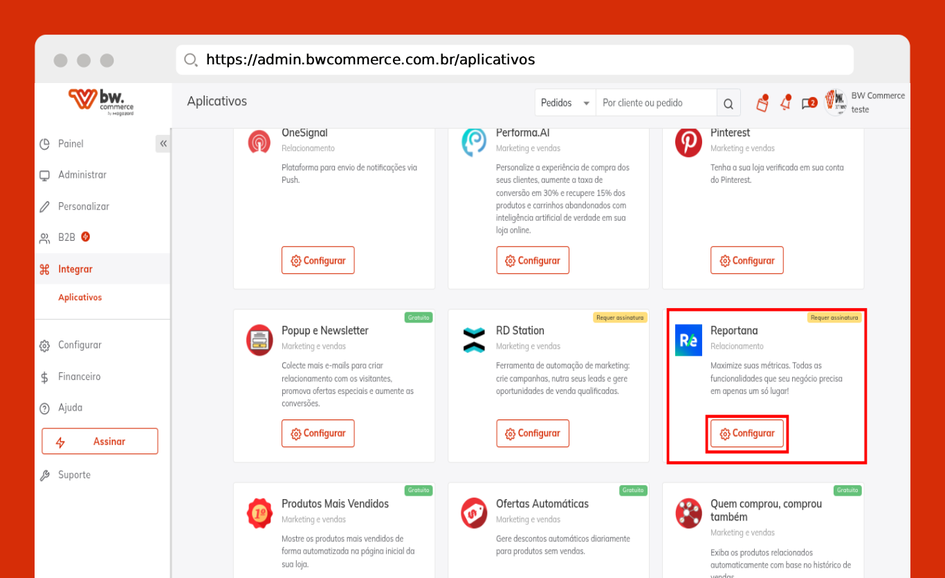 Passo 11) Ao acessar o painel da BW, clique em Integrar > Aplicativos: