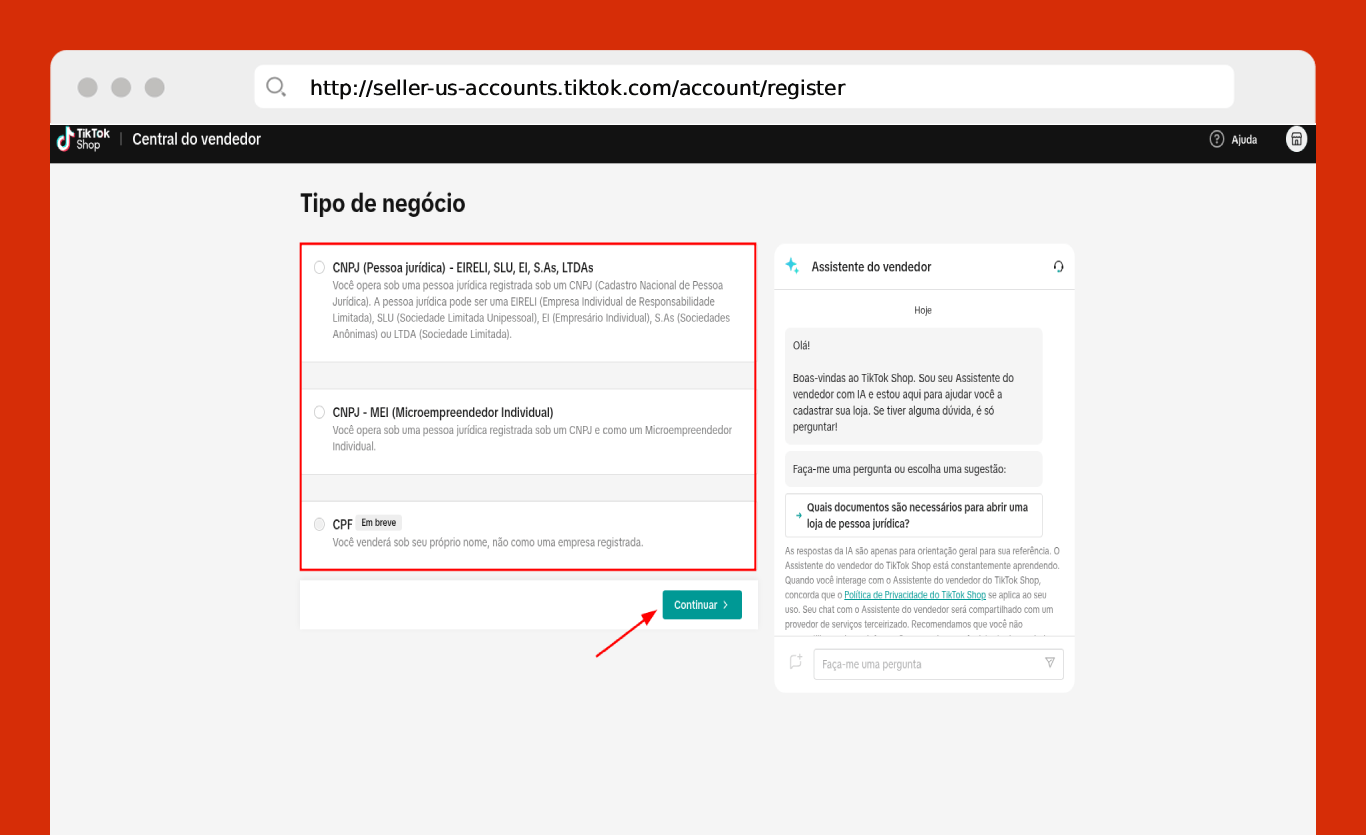 Passo 02) Em seguida, selecione o Tipo de Negócio e clique em Continuar.