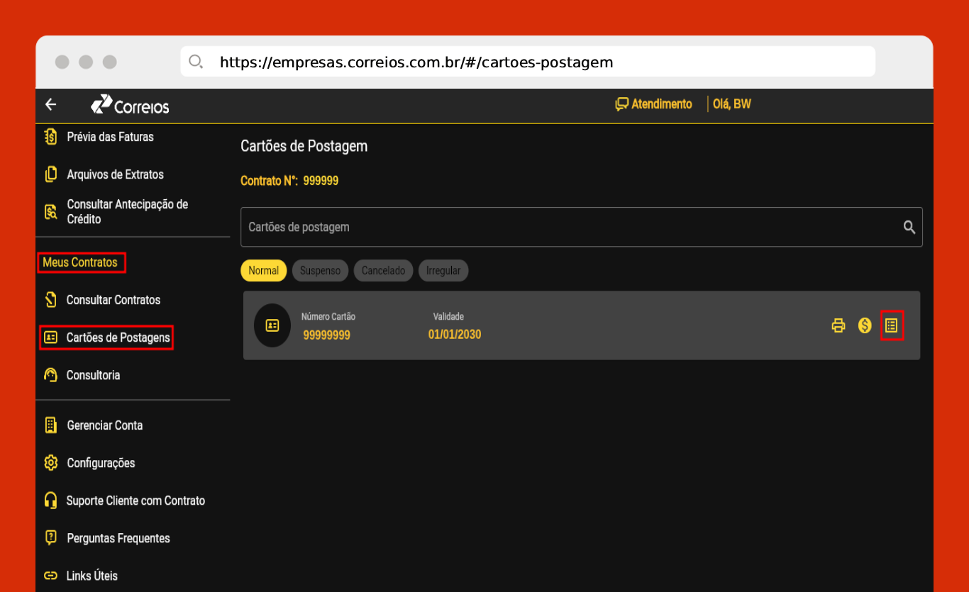 Passo 01) Acesse o painel de postagem dos Correios, vá em Meus Contratos > Cartões de Postagem > Serviços do cartão de postagem.