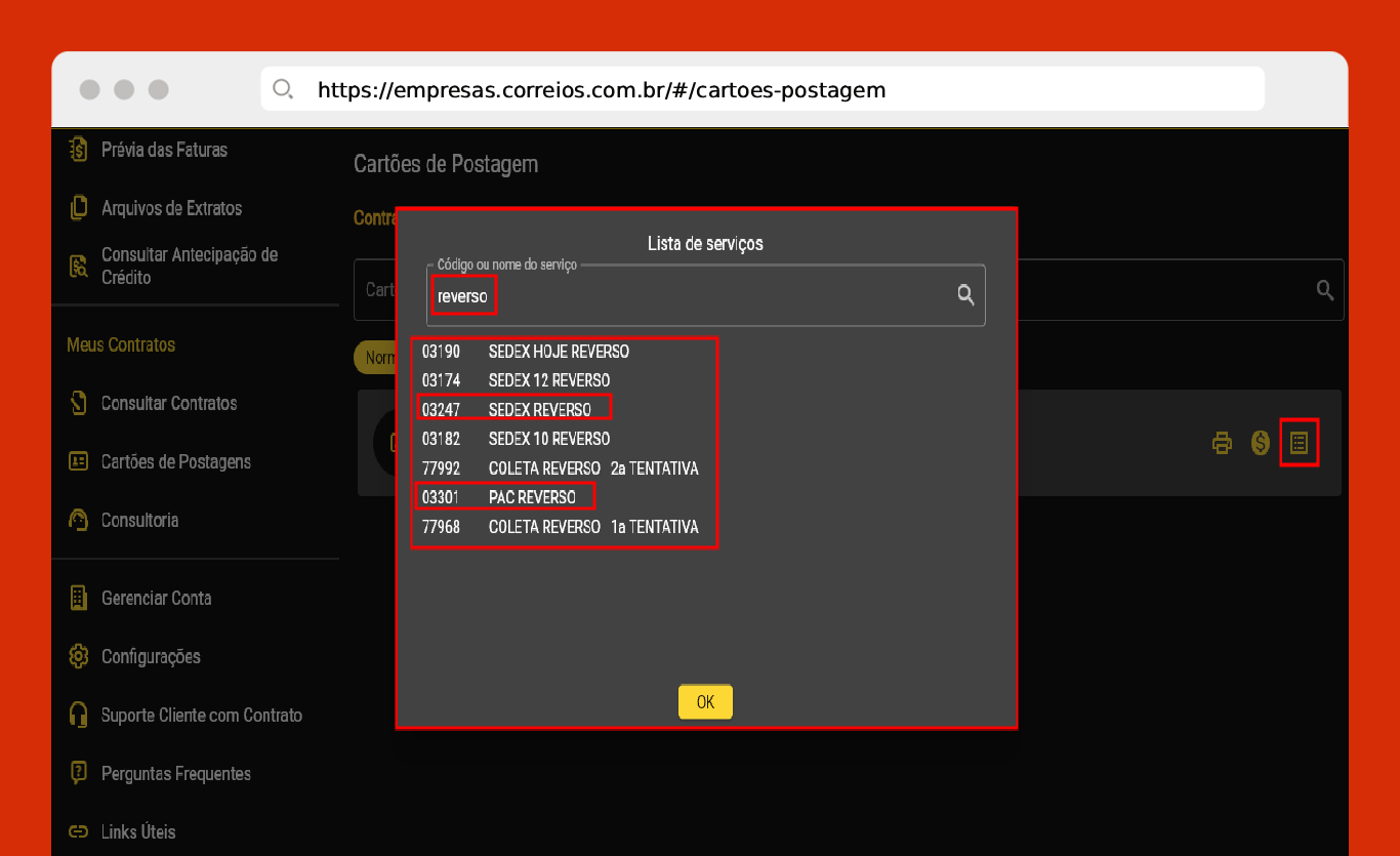 Passo 02) Na página de Serviços do Cartão de Postagem, você poderá pesquisar os códigos de Logística Reversa. Os códigos utilizados para a configuração são: Sedex Reverso e PAC Reverso.