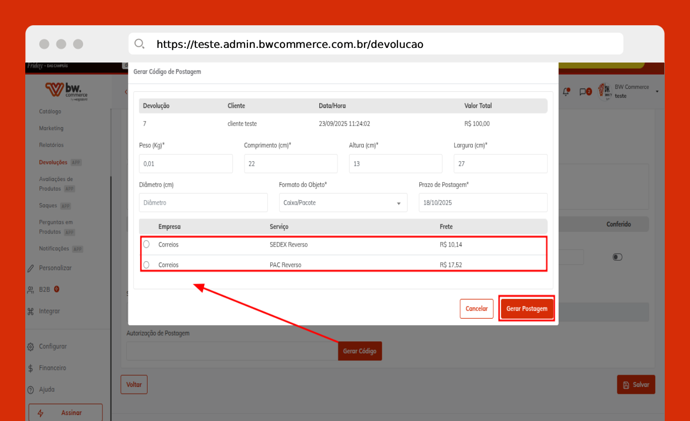 Passo 01) No painel da BW, acesse Devoluções e selecione o pedido no qual foi solicitada a devolução pelo cliente. Em seguida, na opção Autorização de Postagem, clique em Gerar Código. Após isso, serão exibidos os códigos de postagem configurados anteriormente, para que você possa selecionar por qual deles será realizada a devolução do produto.