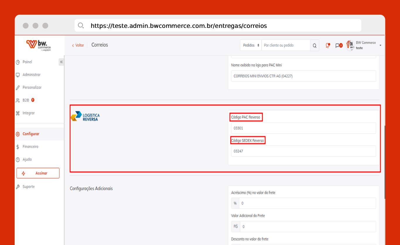 Passo 03) Para realizar a configuração dentro do painel da BW, acesse Configurar > Formas de Entrega > Logística Reversa e preencha os campos com os códigos obtidos no painel dos Correios.