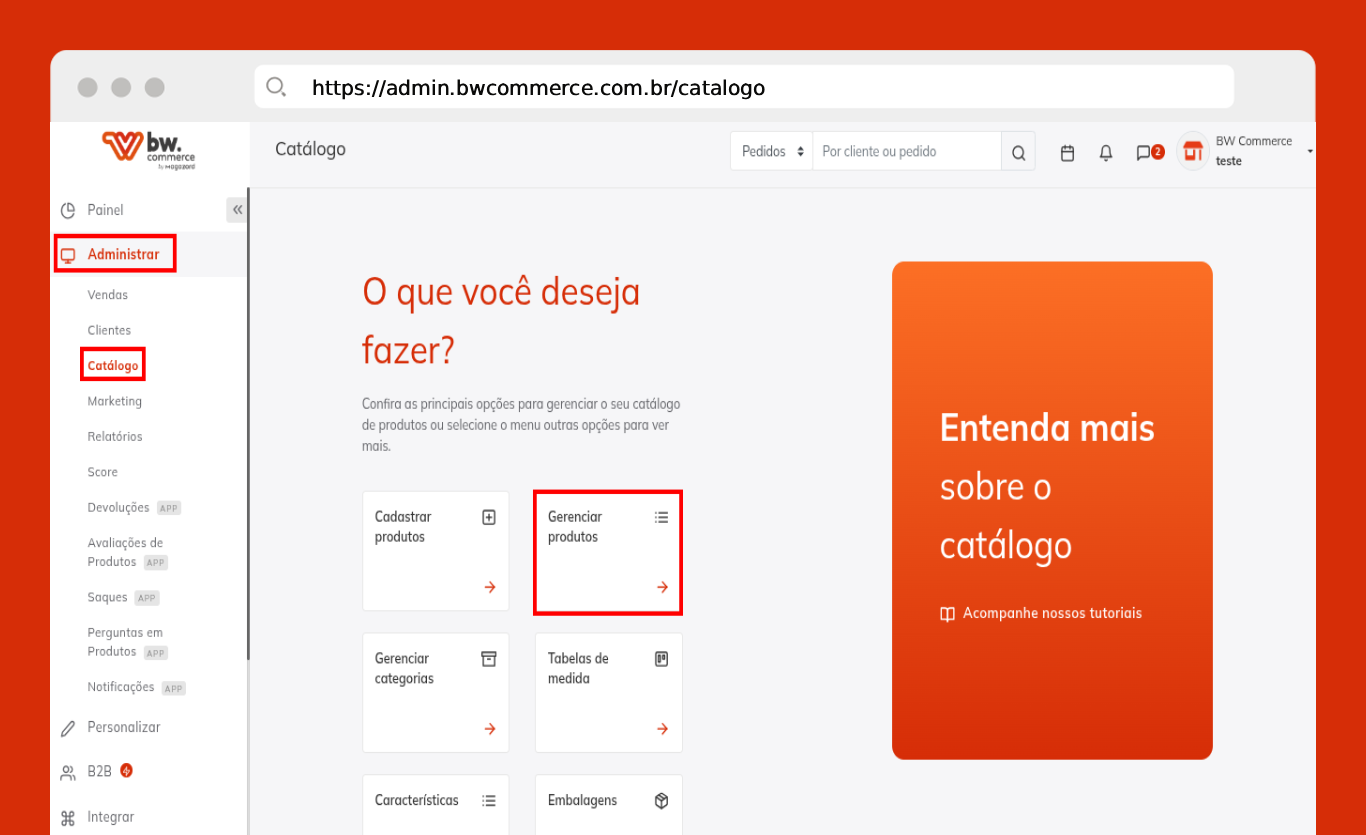Passo 01) Acesse o painel da BW Commerce e selecione Administrar > Catálogo e Gerenciar produtos.