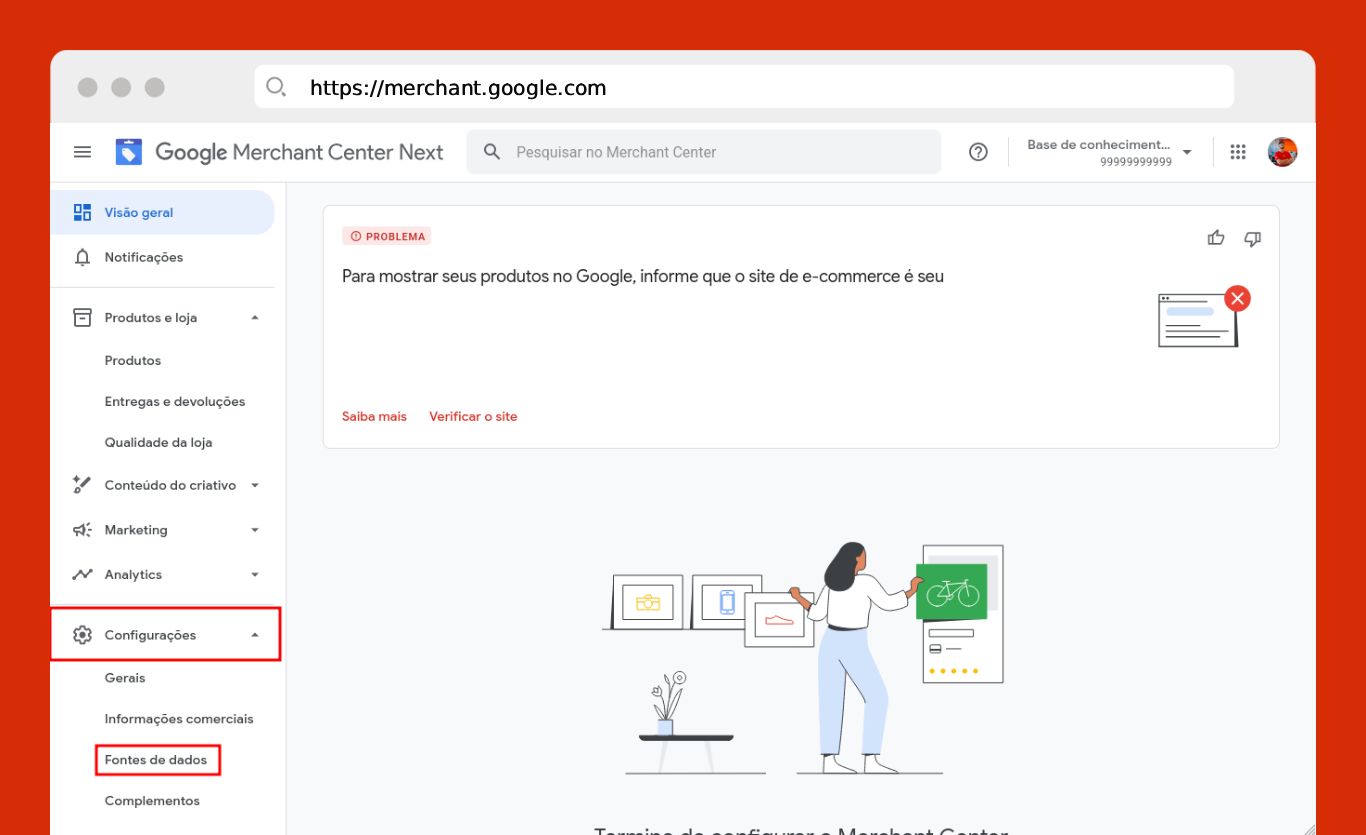 Passo 01) Acesse sua conta no Google Merchant Center. No menu lateral esquerdo vá em Configurações e selecione a opção Fontes de dados.