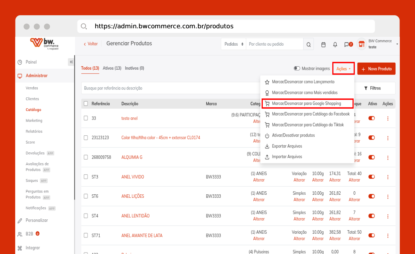 Passo 02) Em seguida clique no botão Ações > Marcar/Desmarcar para Google Shopping.