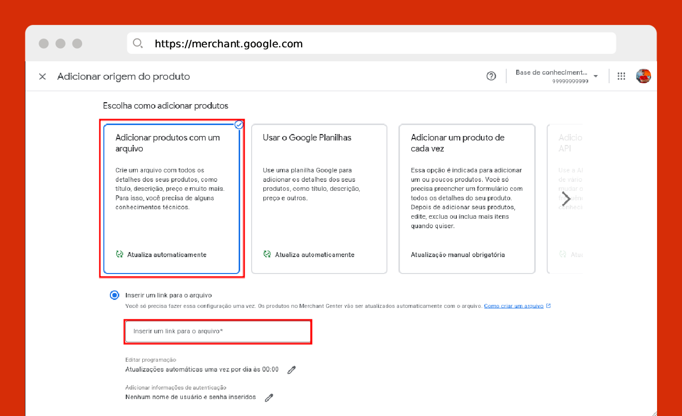 Passo 03) Agora, você poderá escolher a opção de Adicionar produtos com um arquivo e inserir o link do XML copiado no inicio desse tutorial: