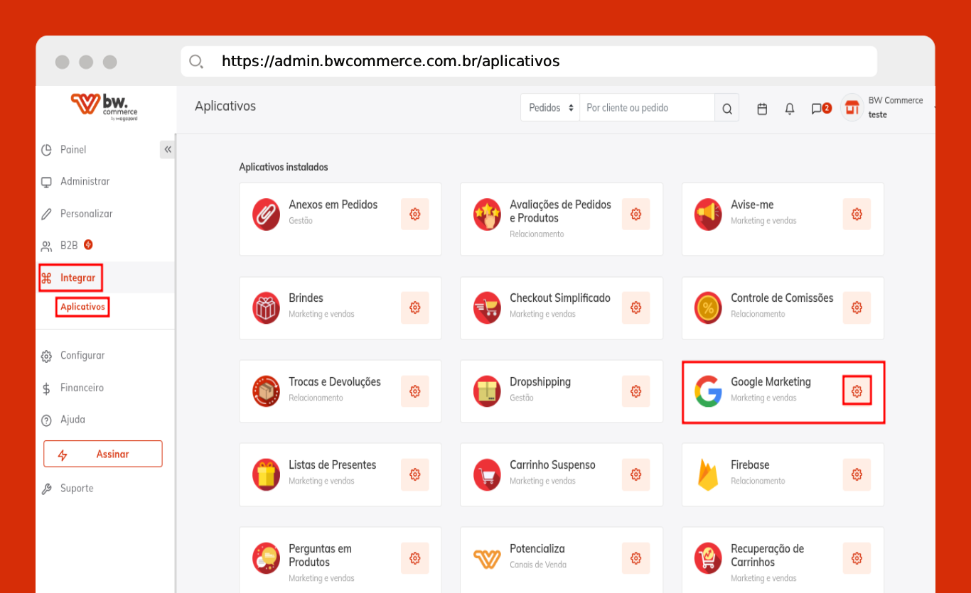 Passo 04) Agora vá em Integrar > Aplicativos e entre no aplicativo do Google Marketing.