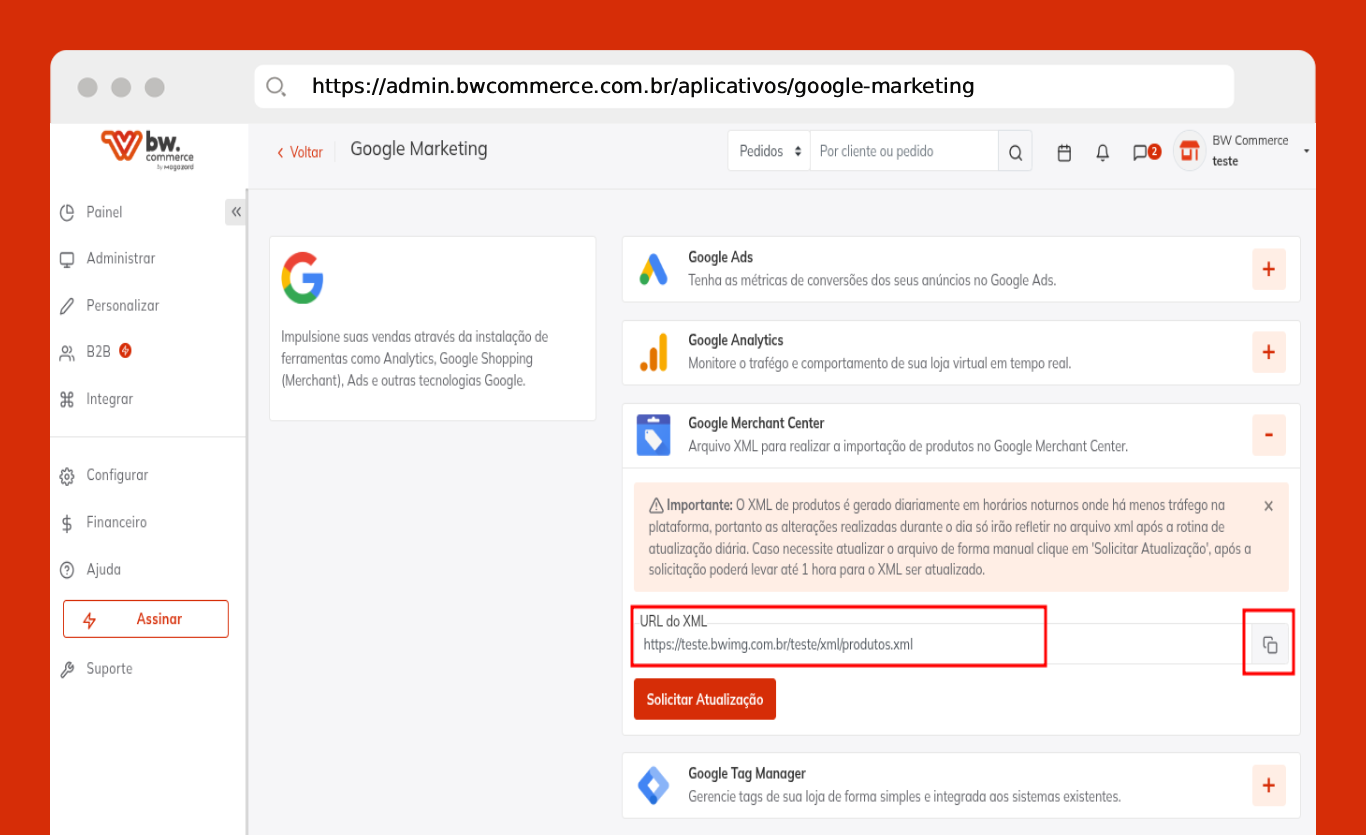 Passo 05) Ná página do aplicativo, abra a aba do Google Merchant Center e copie o link ou clique no ícone a direita para copiar.