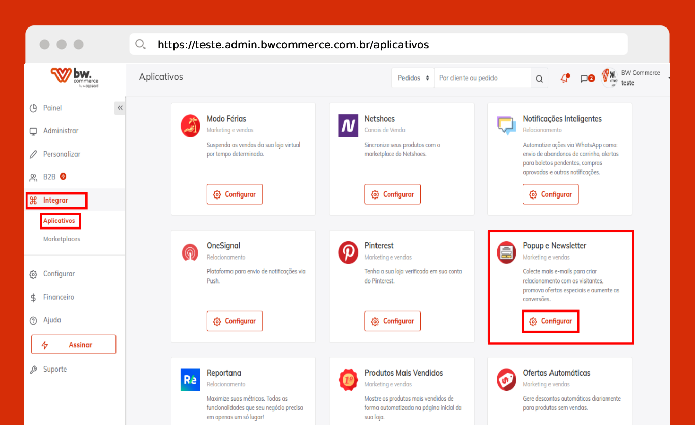 Passo 01) Acesse o painel administrativo da BW Commerce e selecione Integrar > Aplicativos procure por Popup e Newsletter > Configurar.
