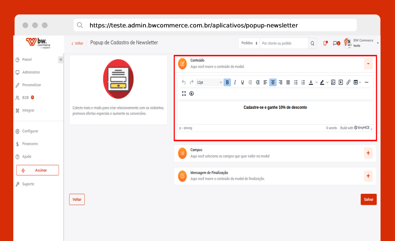 Campos: Neste campo você pode definir quais informações serão exibidas na modal do pop-up.