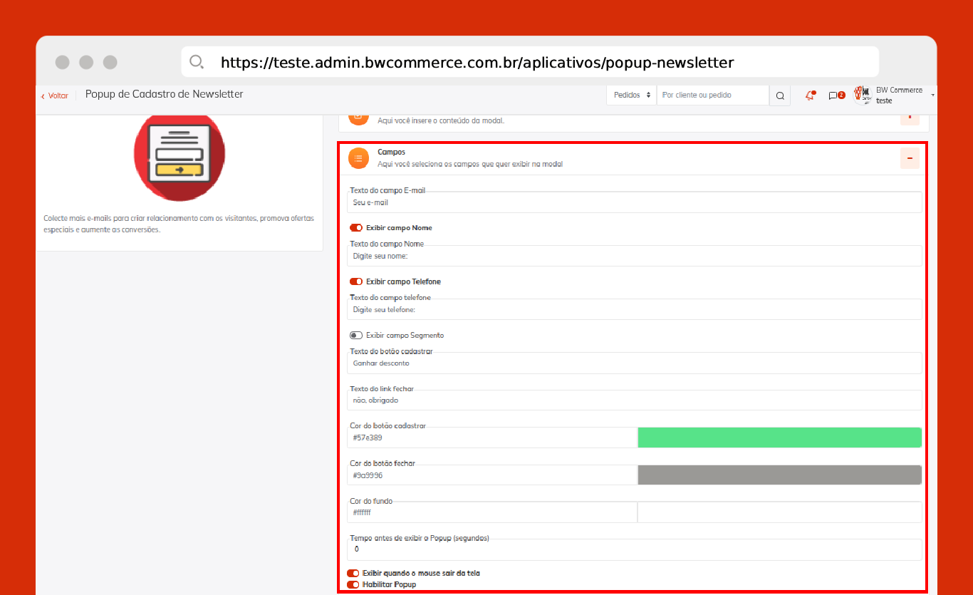 - Além disso, você pode configurar o texto dos botões e links, ajustar as cores do botão de cadastro, do botão de fechar e do fundo do pop-up, bem como definir o tempo de exibição (em segundos) e se o pop-up será mostrado quando o mouse sair da tela.