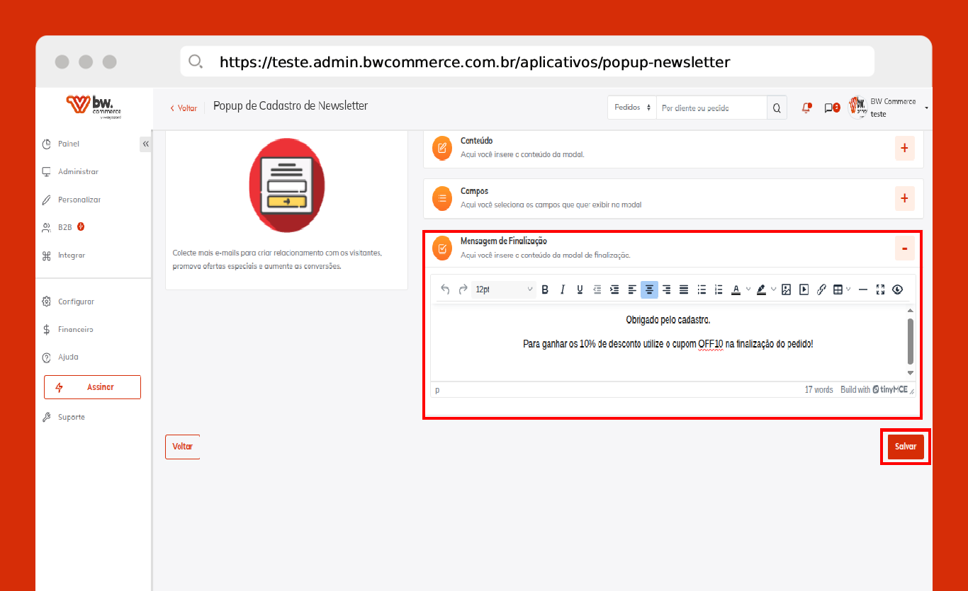 Conteúdo: Neste campo você poderá definir a mensagem que será exibida ao cliente.