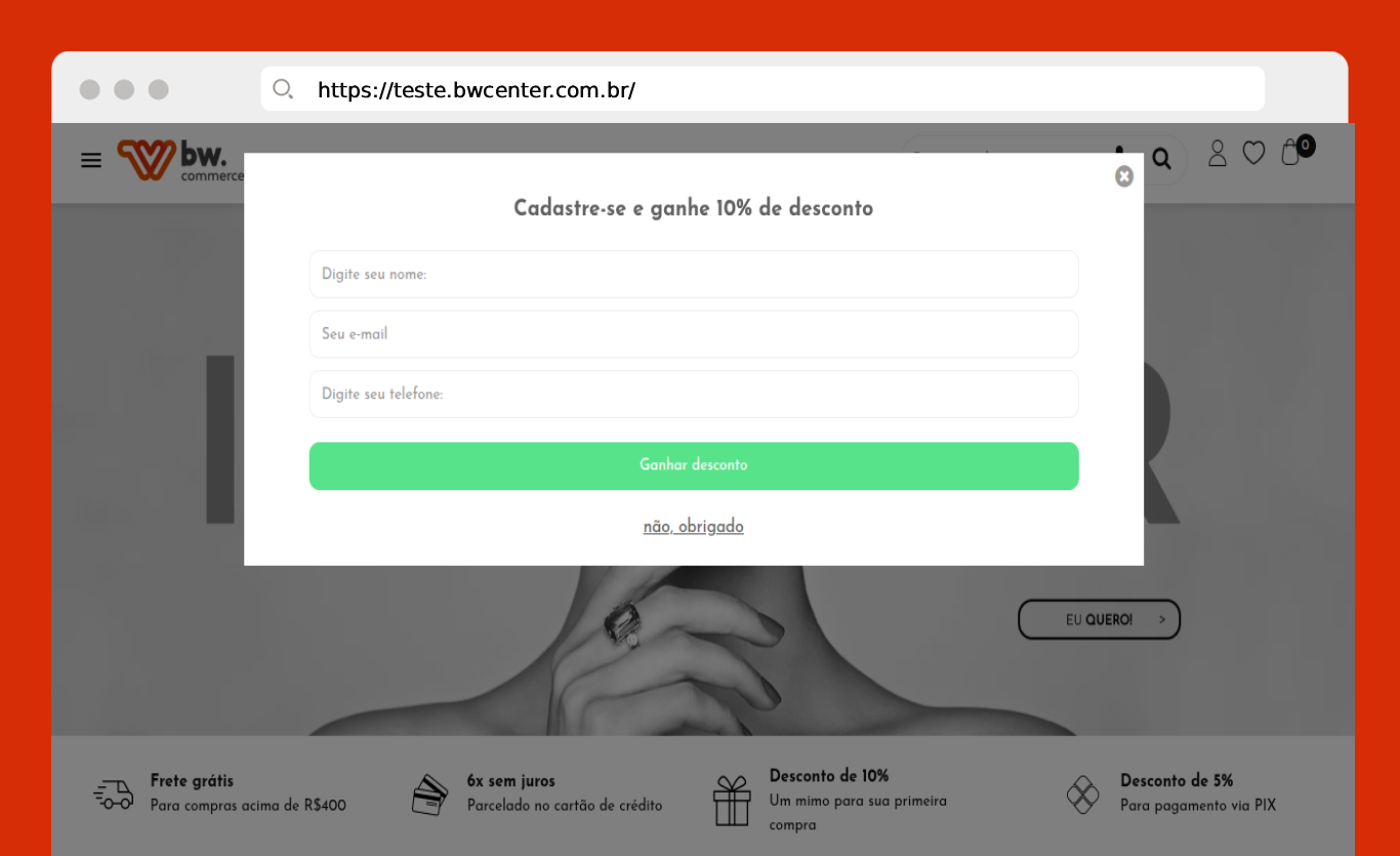 Após configurar o pop-up será exibido assim na sua loja virtual: