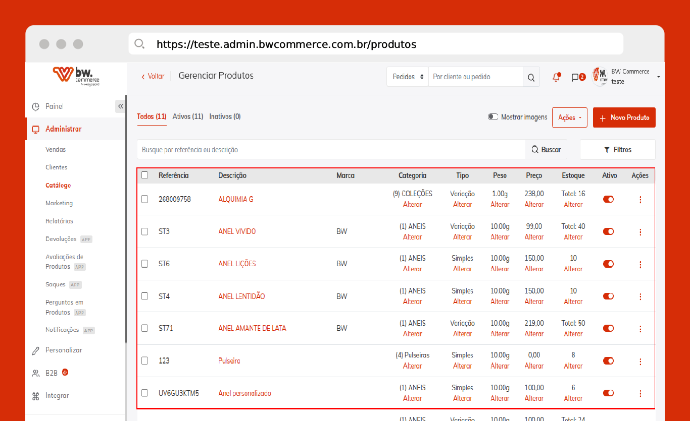 Passo 01) Acesse o painel da BW Commerce e selecione Administrar > Catálogo e Gerenciar produtos: